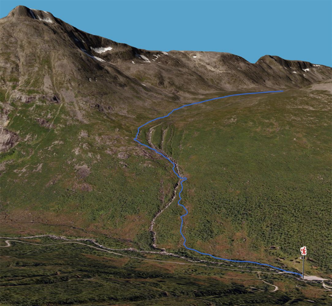 I stikrysset øverst i Hesteheian følger du skilting videre inn dalen og til ei lita hytte. Her passerer du elveosen og følger sti til Høgnosa. Ta av opp til venstre og følg ryggen opp til Mjølvafjellet der du møter normalruta over Romsdalseggen.