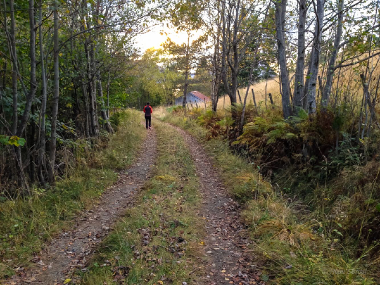 Parker ved Skarbø skule og gå opp i Skarbøfeltet. Etter ein skarp venstresving tek du av på ein skogsveg ganske bratt opp til høgre. På toppen av bakken går du til venstre forbi eit fint småbruk og held fram langs skogsvegen opp til postkassa som heng ved ei grind 1,7 km frå skulen. Her kan du snu om du ynskjer det, eller gjere turen til ein rundtur gjennom skogen på god rås / skogsveg over lia til du kjem ned på vegen på Vestre. Ta til høgre her og gå ned til hovudvegen. Følg gangvegen tilbake til Skarbø skule.