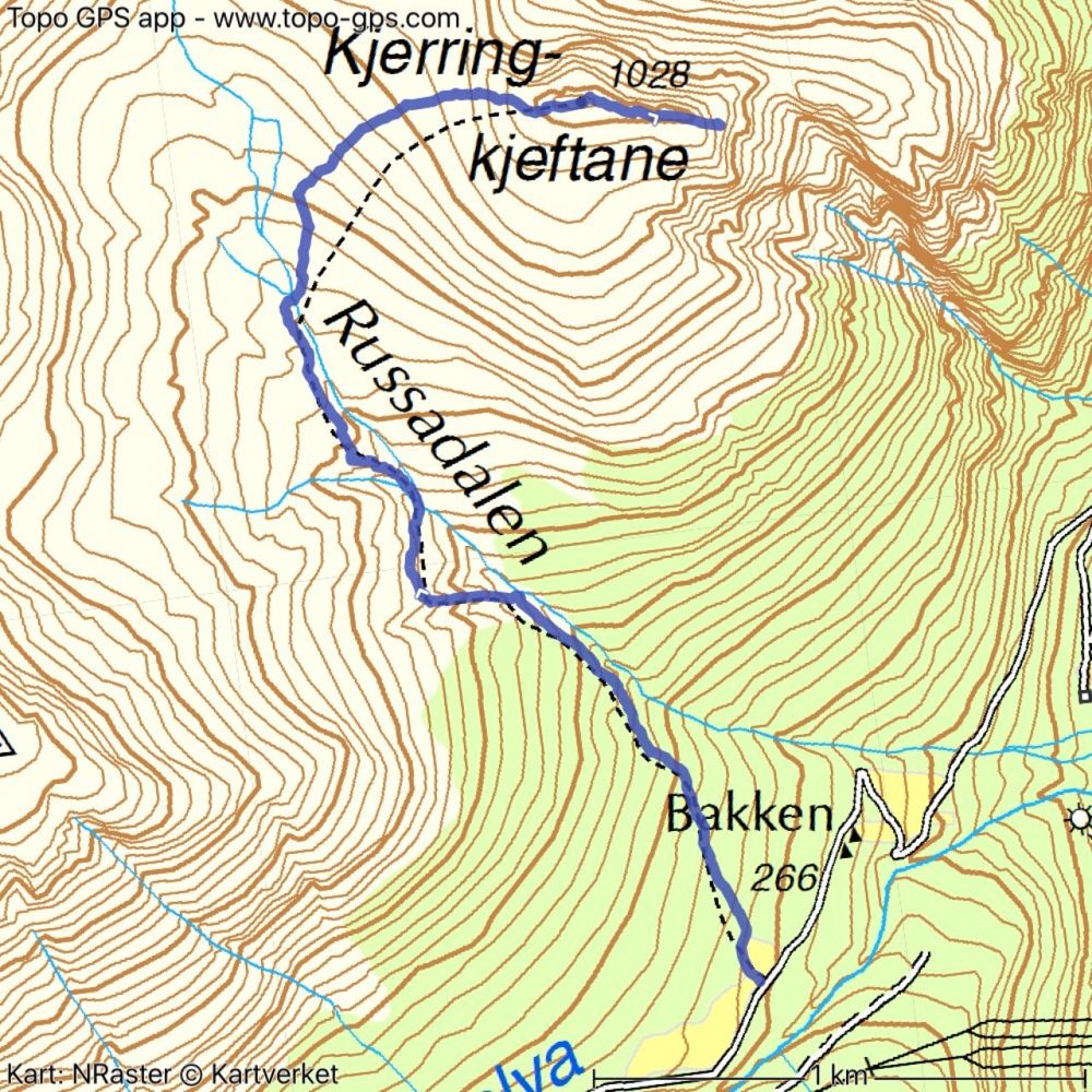 Turen startar ca. 300 m.o.h. og går frå Bakkedalsvegen og langs elva oppover mot Ryssadalen og vidare mot Kjerringkjeftane. Start er skilta på oppsida av Bakkedalsvegen. Første del av stien kan av og til vere litt våt, men så vert det tørt og fint når ein kjem lenger opp. Går normalt greitt å krysse elva, men kan vere litt vanskeleg ved spesiellt stor vassføring. Dersom ein vil ha ein lenger tur kan ein ta til venstre eit stykke før ein kryssar elva, og gå opp på Dukhornet. Så kan ein gå ned frå Dukhornet til Russadalen og så opp på Kjerringkjeftane.