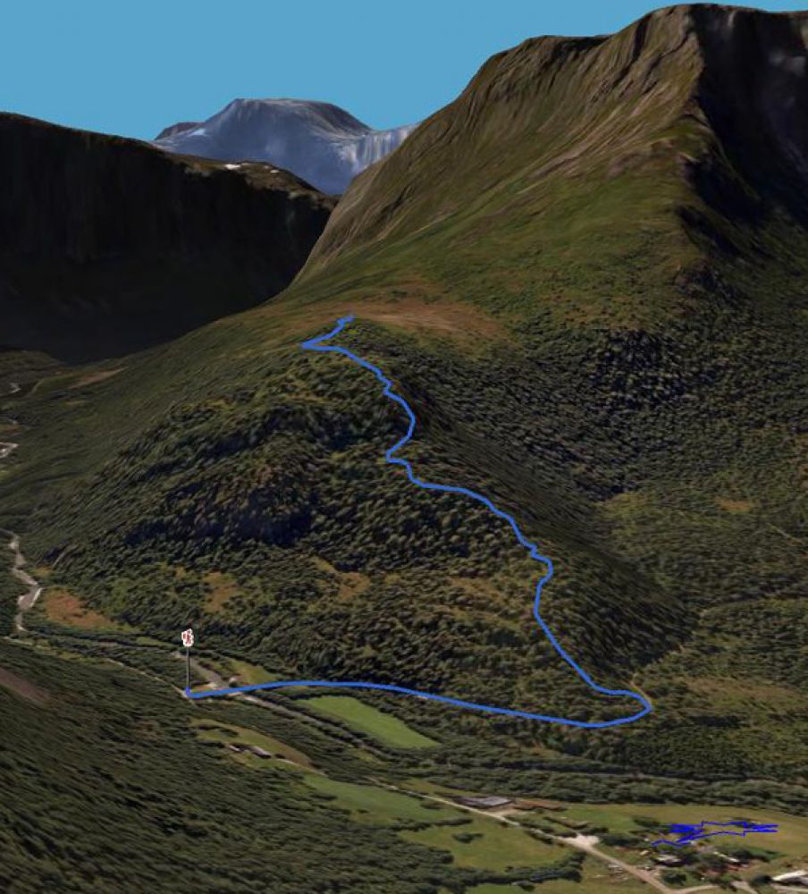 Følg tydelig sti oppover ryggen. Det blir litt bratt et kort stykke like før toppen av platået, der stien går til høyre for ryggen. Fra platået følg sti videre innover til skoggrensa, til kanten av en myr.
