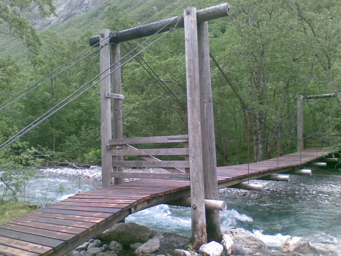 Kløvstien mot Trollstigen fortsetter rett fram før brua.