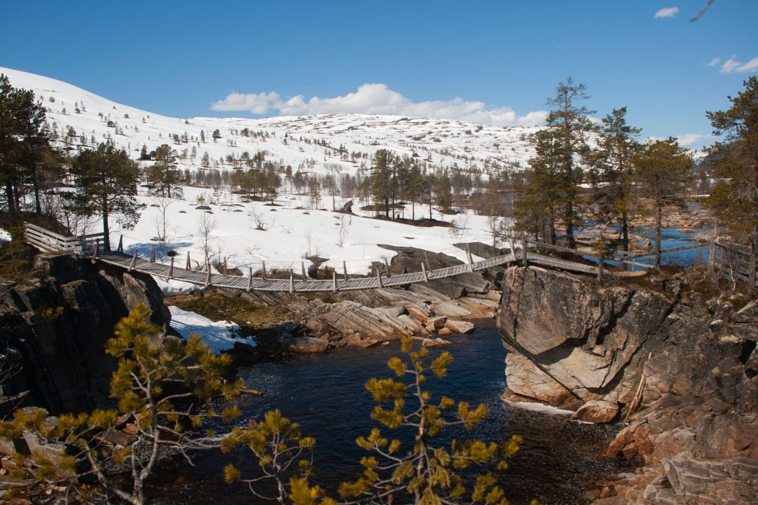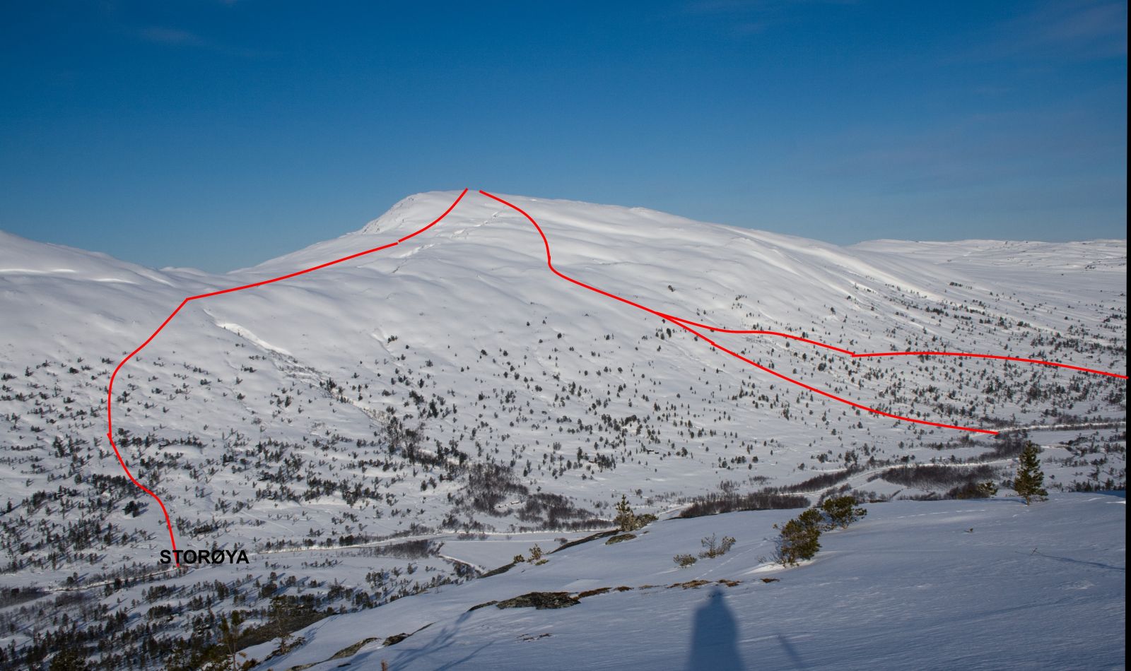 Er elva åpen er det en bru ca 400 m før du kommer til Pebua. Fra brua skrår du opp lia i sydlig retning og fortsetter opp som nevnte løype.På turen ned har du hele fjellsiden å boltre deg i.