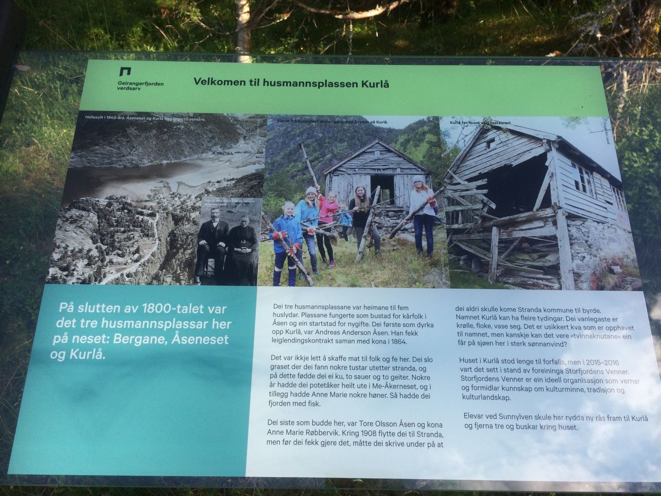 Mykje av turen går langs med Sunnylvsfjorden med godt utsyn, og en går forbi fleire kulturminner. Kurlå er siste husmannsplassen som står langs Sunnylvsfjorden. Den er no fullrestaurert av Storfjordens Venner. Ferdig restaurert i 2016. I tillegg går en forbi 2 andre husmannsplasser på vegen til Kurlå, det er Bergane og Åseneset. I Jogarden står der ein bauta, der den fyrste kyrkja i Sunnylven stod. Endepunkt for turen er husmannsplassen Kurlå. Ein går same vegen tilbake. (Ein kan eventuelt gå opp til gardane i Åsen og følge vegen derifrå og ned til Hellesylt stadion igjen, dette gjev ein fin rundtur om ein ønskjer å forlenge turen, denne turen er ikkje beskreven på kartet.)