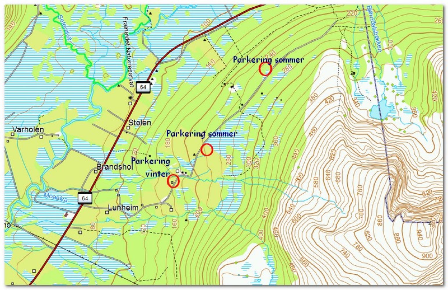 Sommerparkering: kjør opp og forbi fellesbeitet, skiltet turparkering ved grinda.