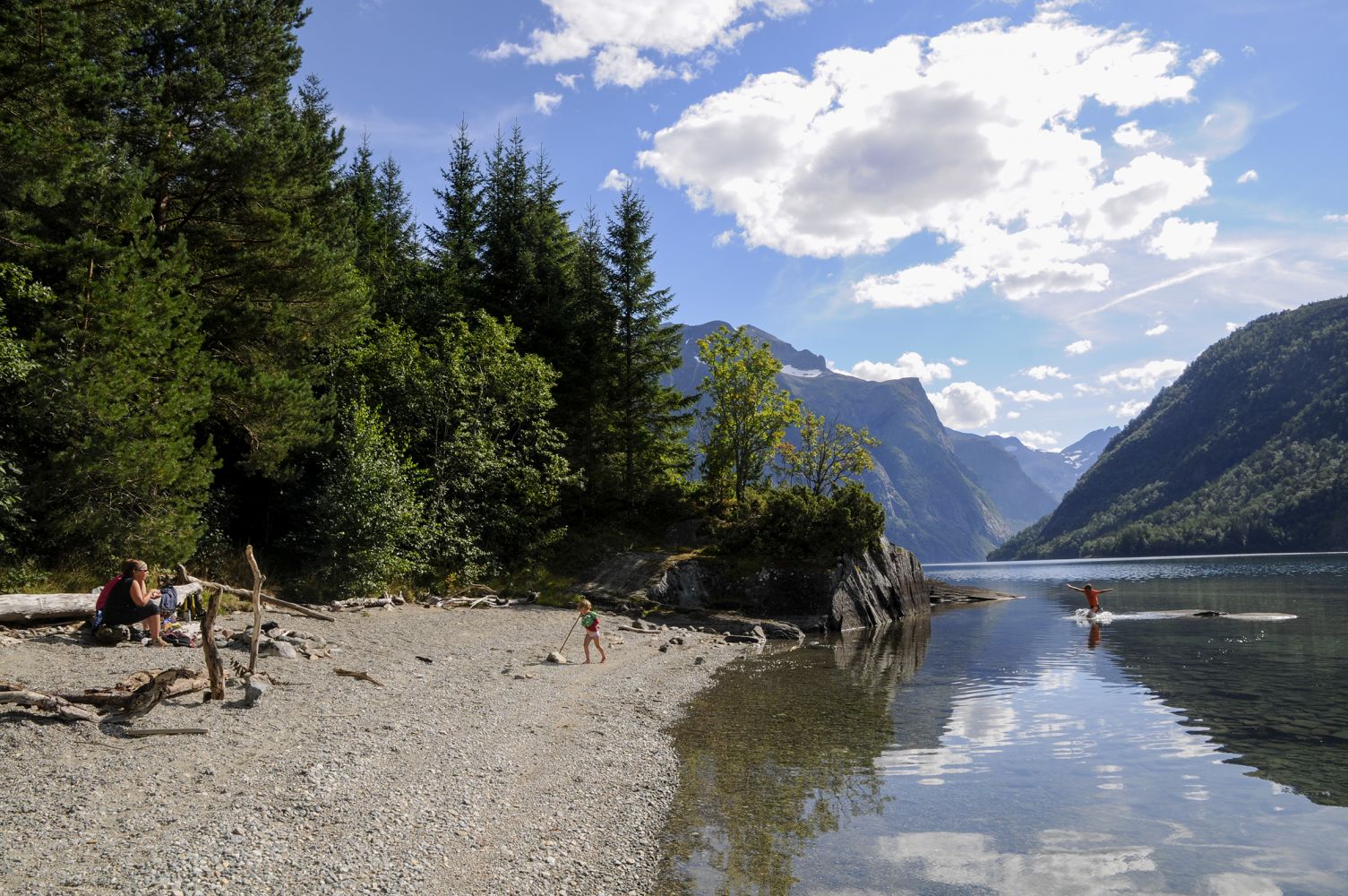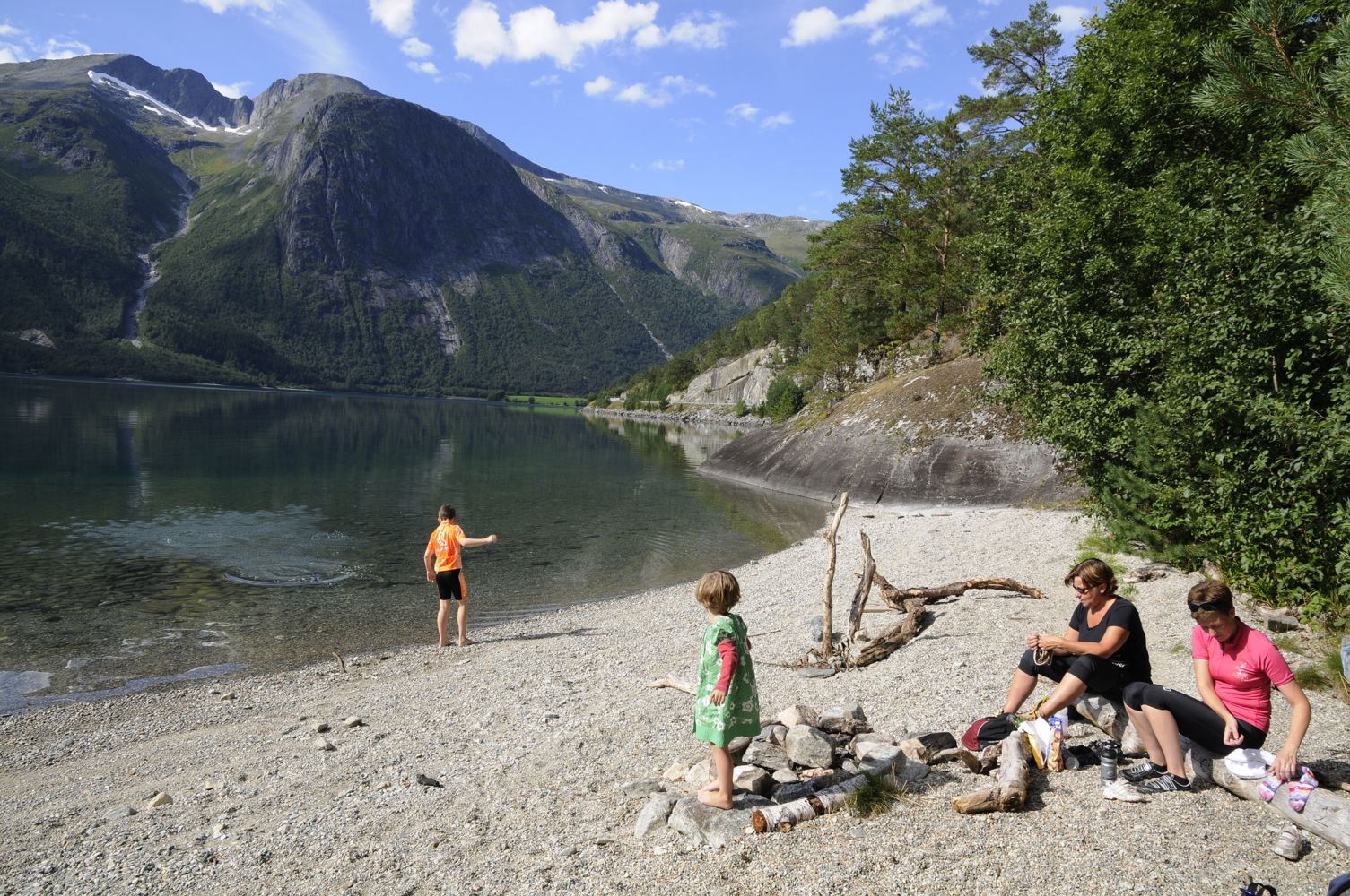 Kort og fin gå eller trilletur langs Eikesdalsvegen. Storslagen utsikt sørøver Eikesdalsvatnet mot Fløtatind og Vikesaksa. Turen ender på ei fin lita sandstrand rett nedom fylkesvegen. På ein varm dag tar du gjerne ein forfriskande dukkert i Eikesdalsvatnet.Eller ta med mat og drikke og slapp av !