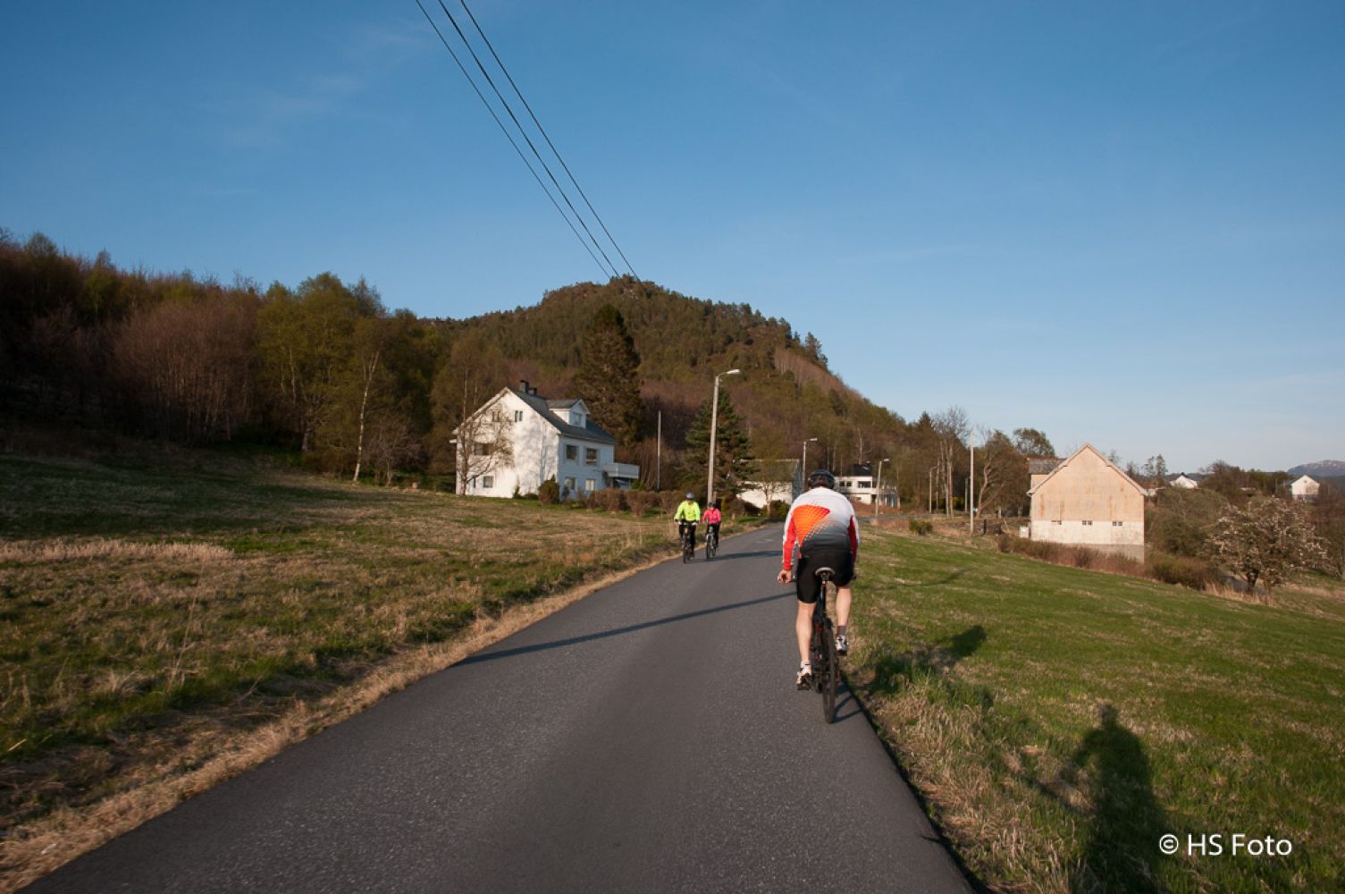 Dette er et greit strekk med liten trafikk. Neste korsvei er hovedveien, igjen. Vi må over denne, og sykle noen meter vestover, motsatt vei enn den vi har syklet så langt. Når du kommer til skiltet 'Myklebust', tar du av og følger skiltet mot nord. Veien svinger og går østover.
