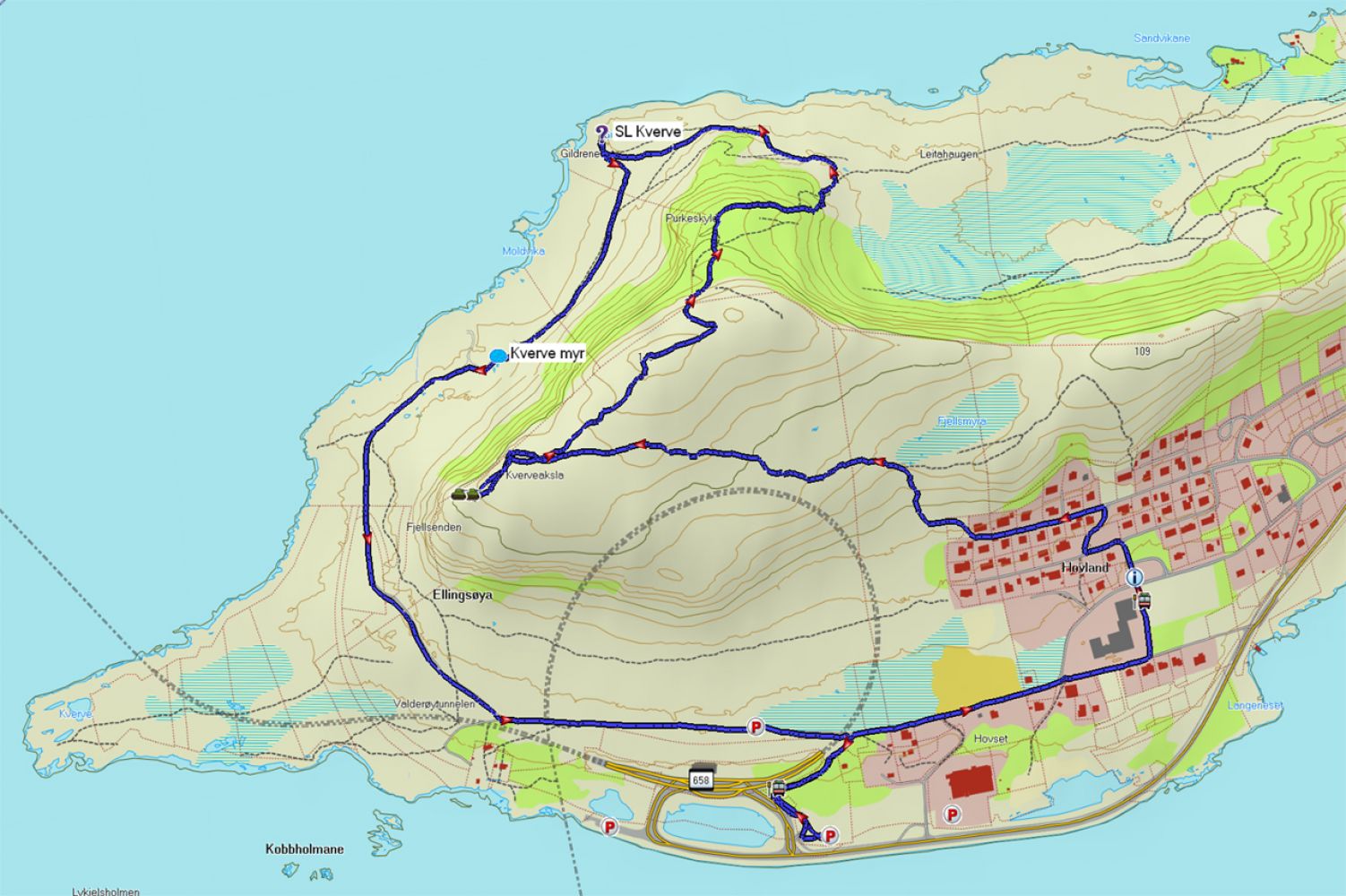 1) Parkering anleggsområde. Dette er en skiltet parkeringsplass på et anleggsområde mellom busstoppet ved Ellingsøytunnelen og Kvervesenteret. Her går det en sti rett mot nord og inn på veien mot Øvre Hoffland.