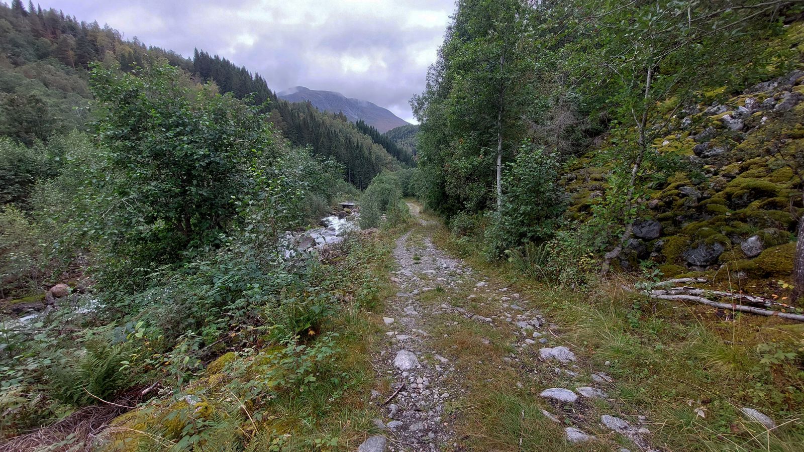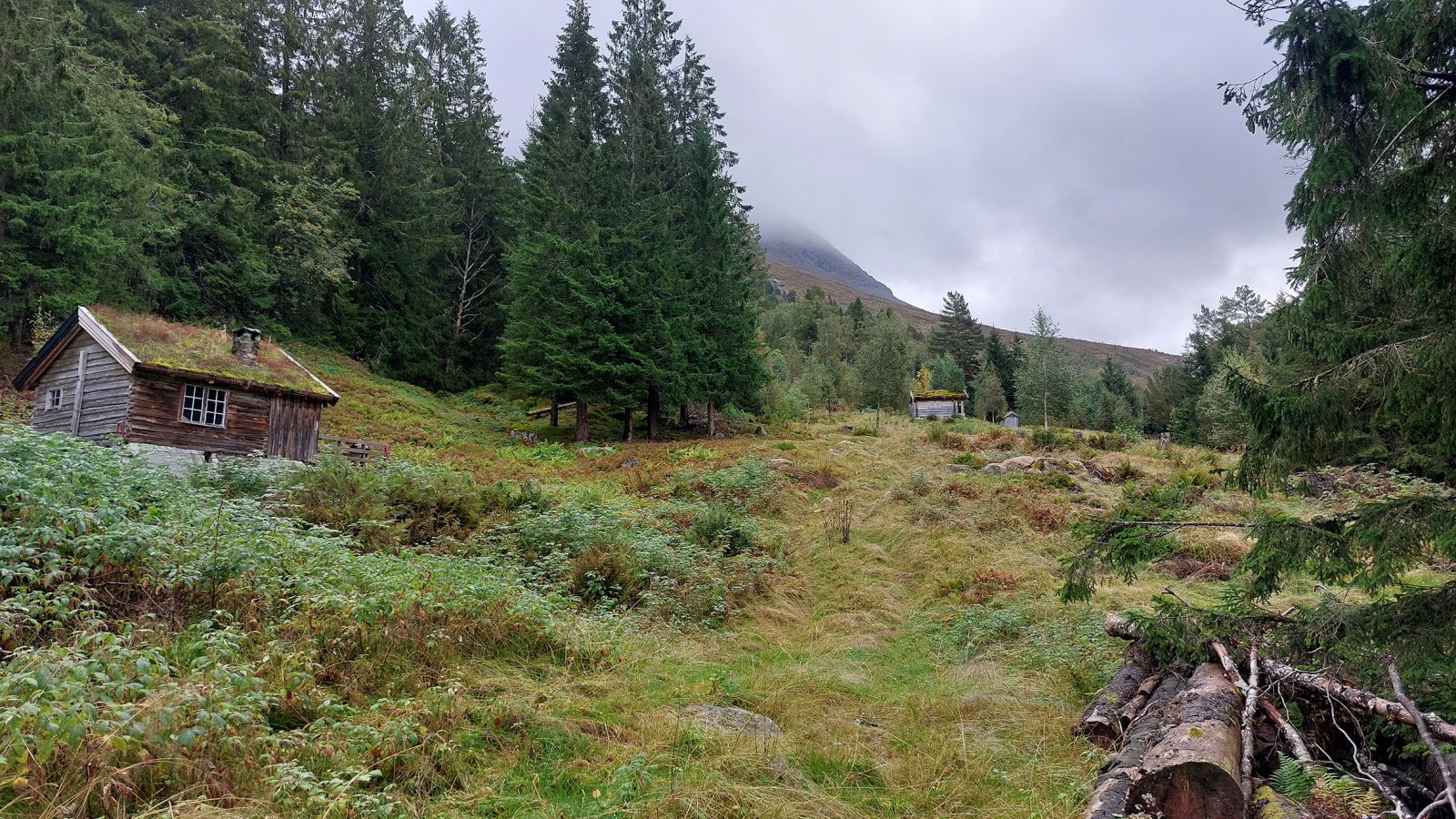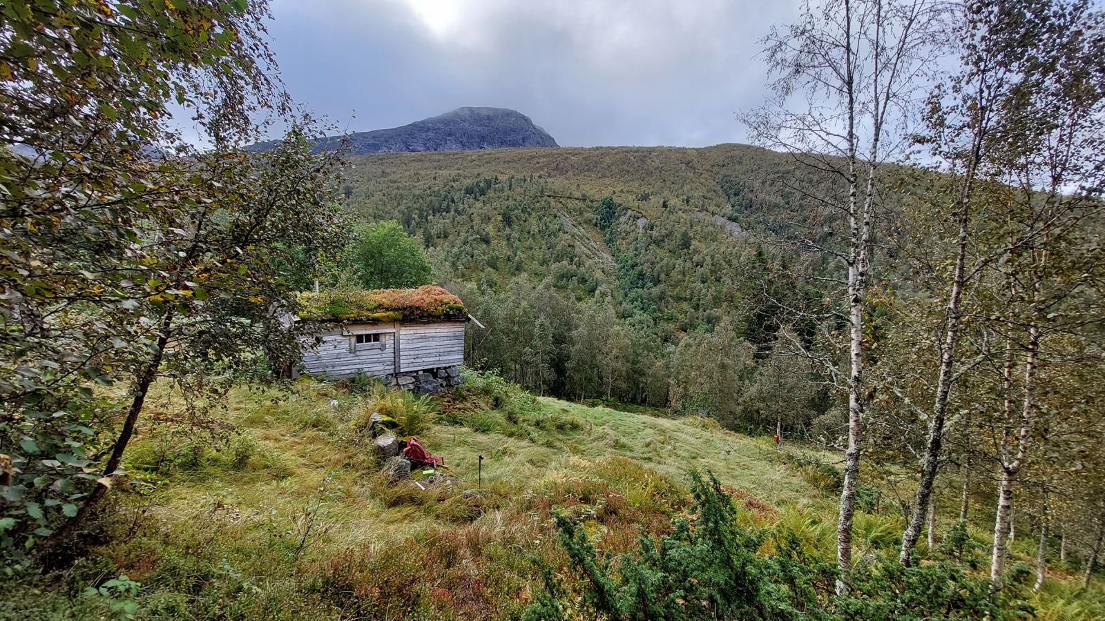 Fin og enkel tur langs traktorveg opp til ein gamal seterstøl i Kvidalen, den trange dalen mellom Skjorta og Goksøyra. På veg opp høyrer du bruset frå Kvidalselva og ser rett opp mot toppen av Skjorta.