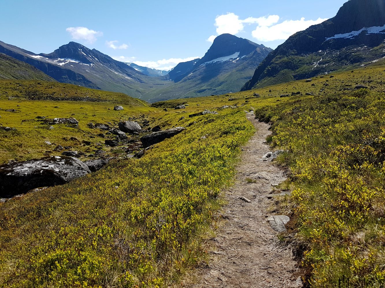 Start ved kraftverket. Første del av turen går på grusvegen i ca 800 m. Gå vegen heilt til endes til eit lite bygg. På sørvestsida av bygget fortsetter du turen inn Fladalen på god sti. Etter ca 400 m (540 m.o.h.), skal du krysse elva (N62° 15.946' E6° 23.273'). Stien går vidare på ein morenerygg mellom to elveløp. Du har flotte tindar på alle kantar når du går inn dalen her.
