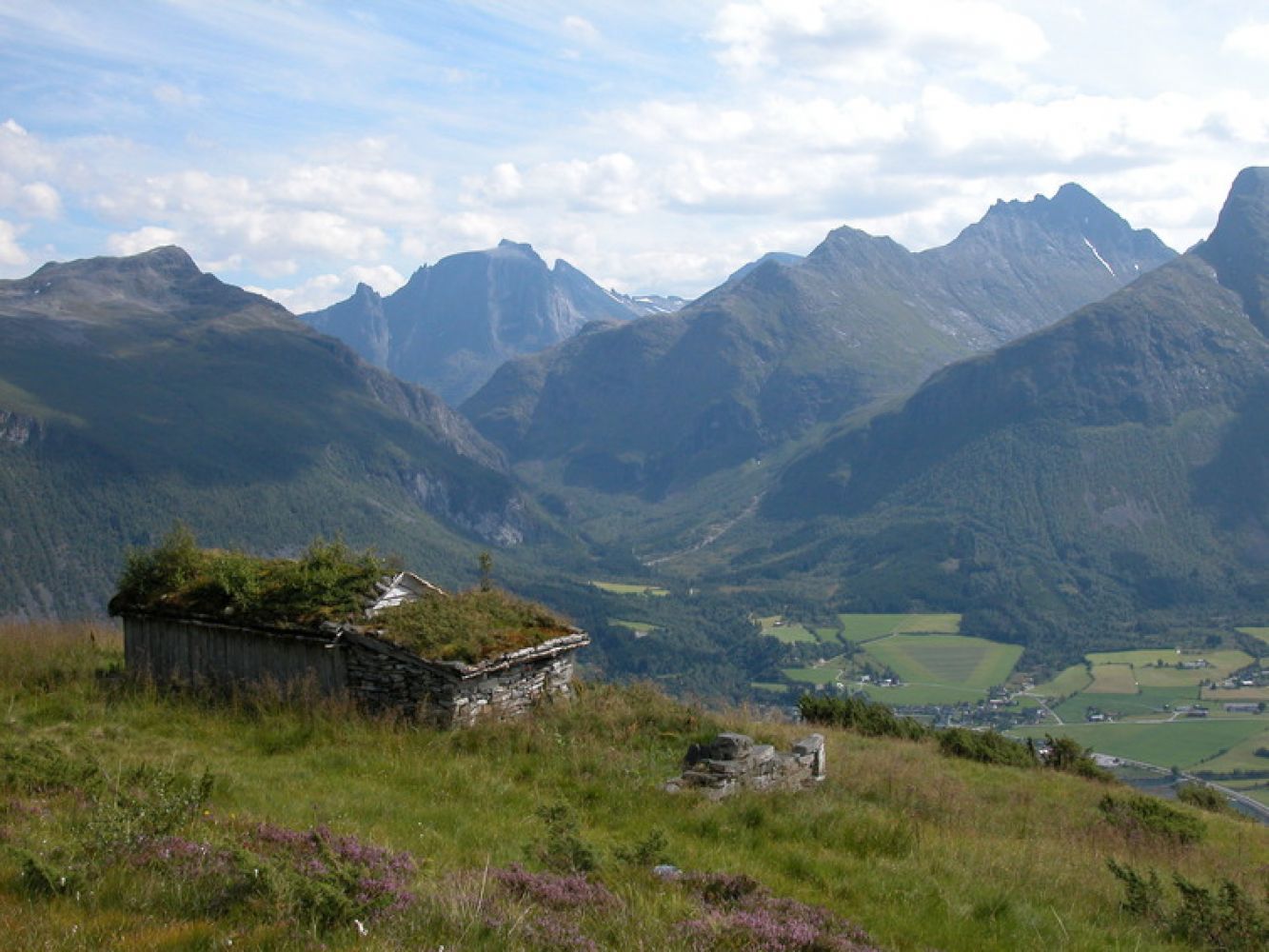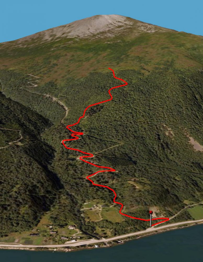 Følg deretter merket skogssti som krysser seg opp gjennom lia. Siste stykket skrår stien slakt mot venstre fram til setrene som ligger flott til på kanten mot Innfjorden.
