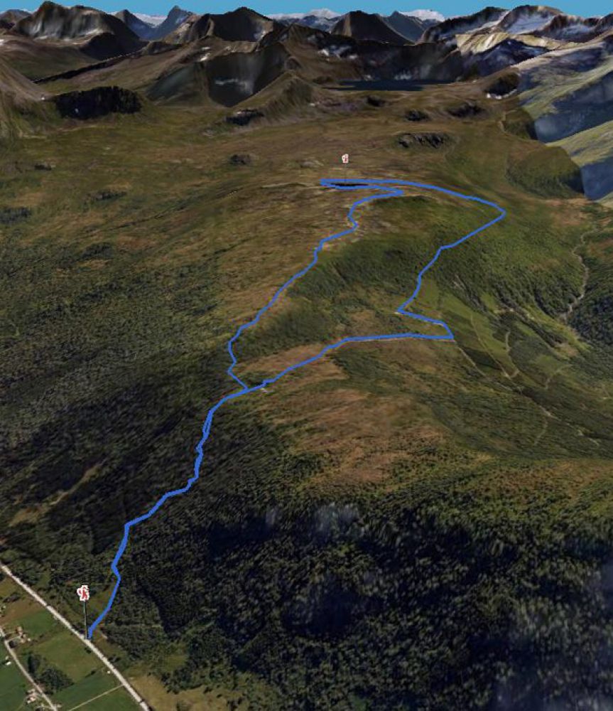 Ta av til venstre mellom de to første hyttene og følg kanten et stykke forbi ei lita myr. Stien går opp i venstrekanten av myra, og går så et stykke oppover inne i skogen før en kommer opp til skoggrensa.