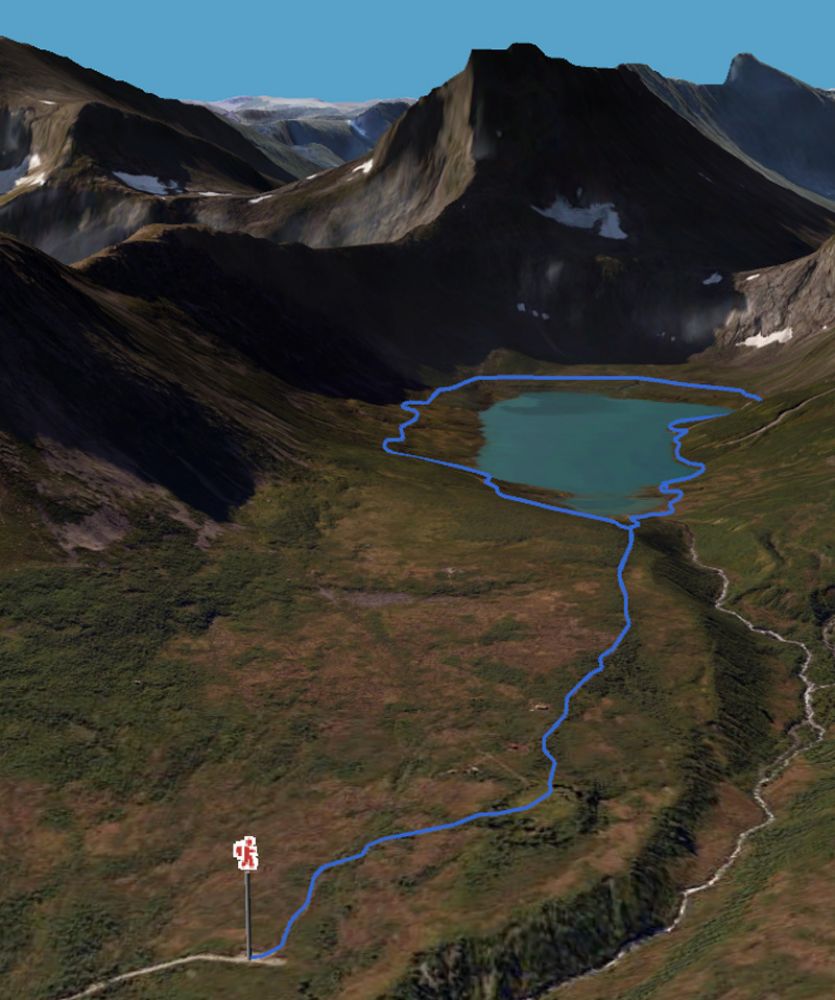 Etter den andre elvekryssingen, like før inste enden av vatnet følg stien oppover til høyre opp til en terrasse som går rundt hele inste enden av vatnet. Det er to stier rundt enden, en litt nærmere vannkanten, men sporet viser den innerste som er bedre sti.