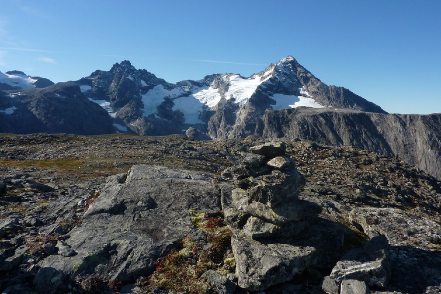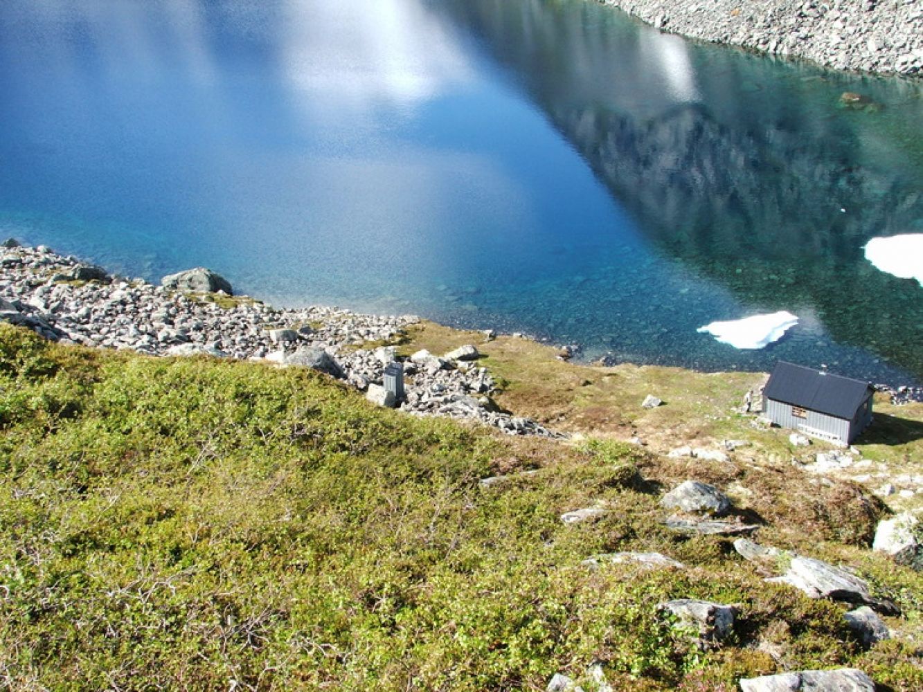 Kryss tilbake over elva og følg kanten av vatnet gjennom ura, før det begynner å stige. Tydelig og godt merket sti, men et par bratte partier før det legger seg like før Middagsvatnet og hytta. Etter hytta følg godt vardet sti som går først slakt innover og så på skrå oppover mot Middagsfjellet.