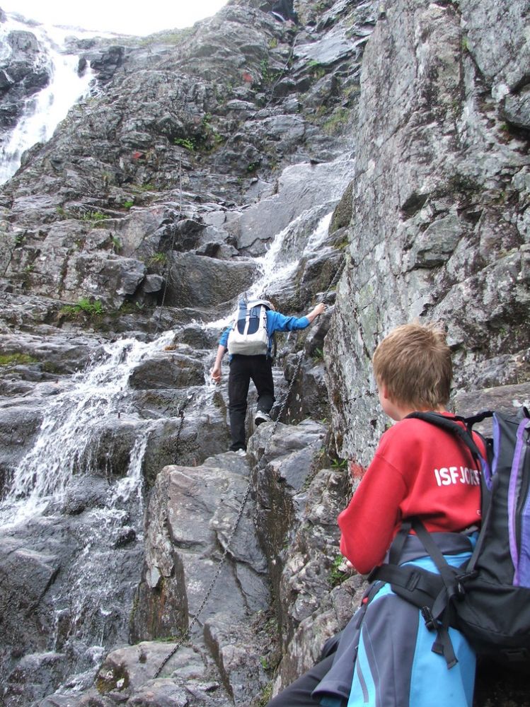 Før skoggrensen går stien bratt oppover langs en rygg. Etter skoggrensen er stien tydelig der den krysser ura fram mot elva, der det blir bratt. Det bratte partiet er godt merket, og sikret med kjetting og wire. Der er luftig ca. 300 meter, før terrenget legger seg og stien krysser oppover ura til toppen av skaret.