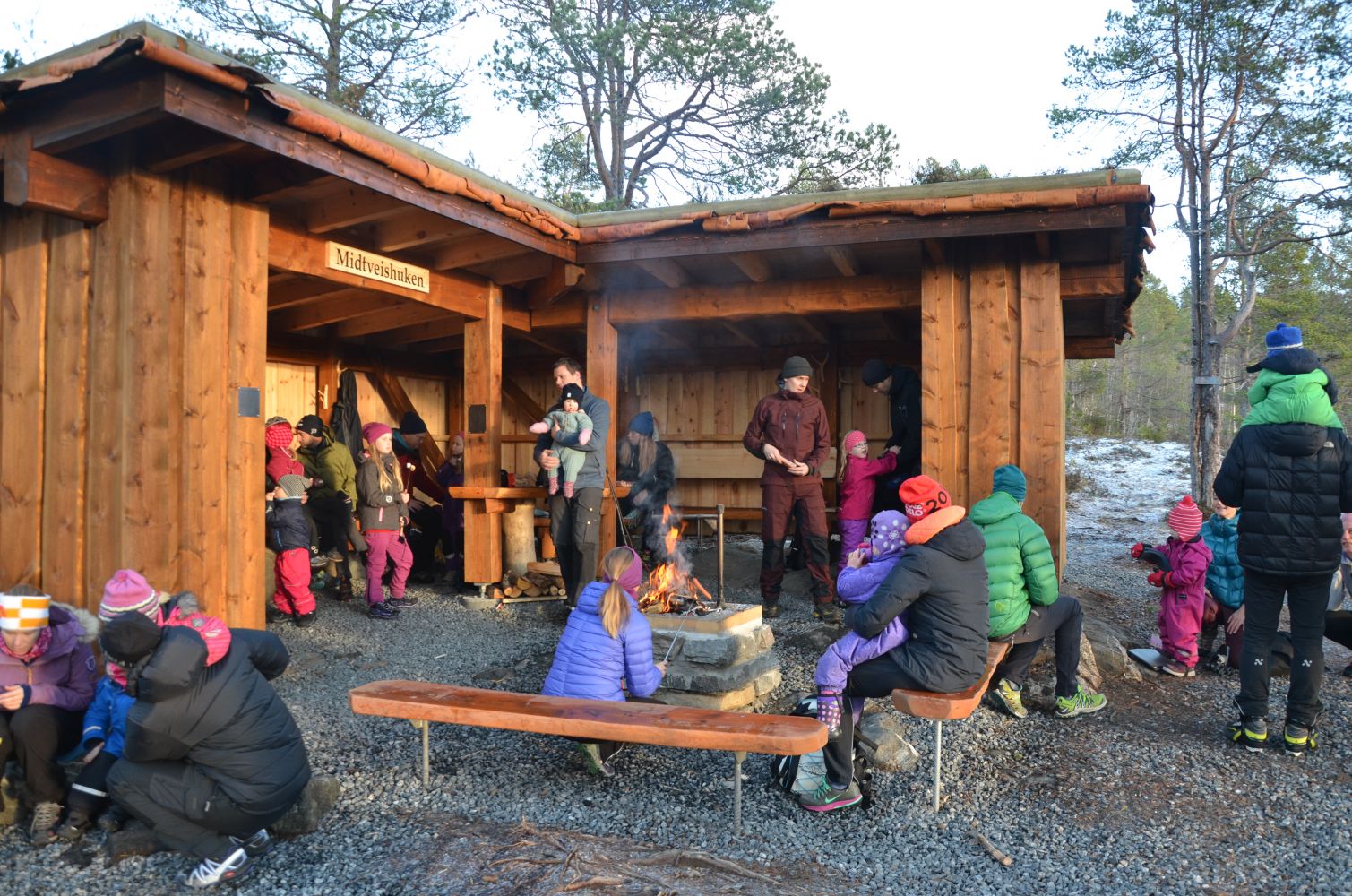 Turen starter ved turparkeringen i Jensgurilia. Følg grusvei fra nord-øst på parkeringsplassen forbi Hindalsrøra vannanlegg. Gå rundt Øverlandsvatnet motsols eller medsols, Midtveishuken ligger, som navnet sier, midtveis på Runden rundt vatnet. Her er Stikk UT!-turmålet med postkasse og kode. Midtveishuken har rikelig med sitteplasser, også under tak, og muligheter for bål og grilling på grue.