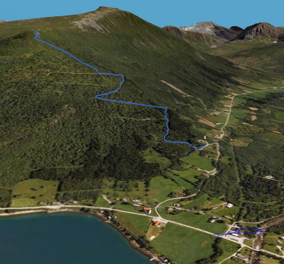 Mot toppen av traktorveien tar man av til høyre, og følger deretter en fin sti til fjells. Stort sett greit terreng, men det kan bli noe bratt mot toppen.