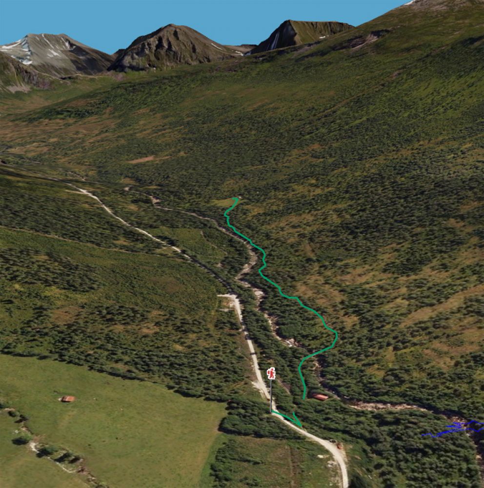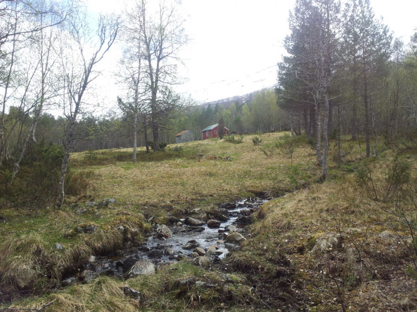 Stien går flatt innover litt til høyre for Mittetelva, litt slakt oppover til setervollen siste stykket.
