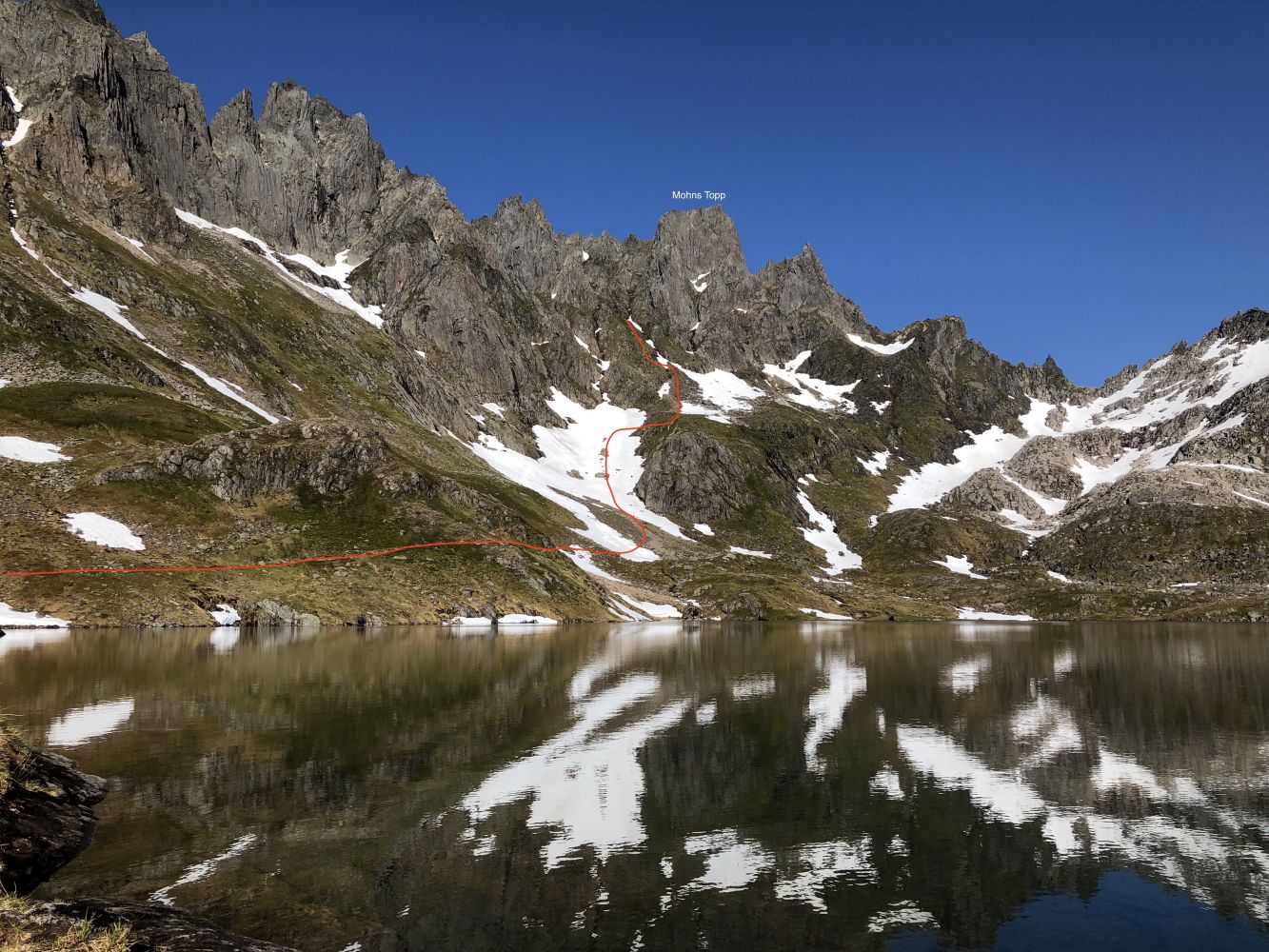 I renna blir det etter hvert så bratt at du nok må bruke hendene på enkelte passasjer. Det finnes noe løsgods i renna, så vær oppmerksom dersom det befinner seg folk over deg. Bruk av hjelm kan være aktuelt. Vær også forsiktig så du ikke løser ut stein på andre. Etter ca. 500 høydemeter fra vannet, når du toppen av renna. Fortett svakt mot venstre og litt bratt ned på norsiden mot Inste Årsnesdalen. Dersom du vil helt bort til tindenåla Bladet, må du nok inn på snø/bre her. Pass på så du ikke går for langt nord og ut mot der breen knekker ned mot fjorden. Utglidning her vil kunne få store konsekvenser. Følg samme vei tilbake mot Mohnsrenna, og fortsett i utsatt og luftig terreng sørover til toppen av Mohns Topp. Returner samme vei, men på returen kan du ta direkte ned Mohnsrenna uten å gå tilbake til Bladet.