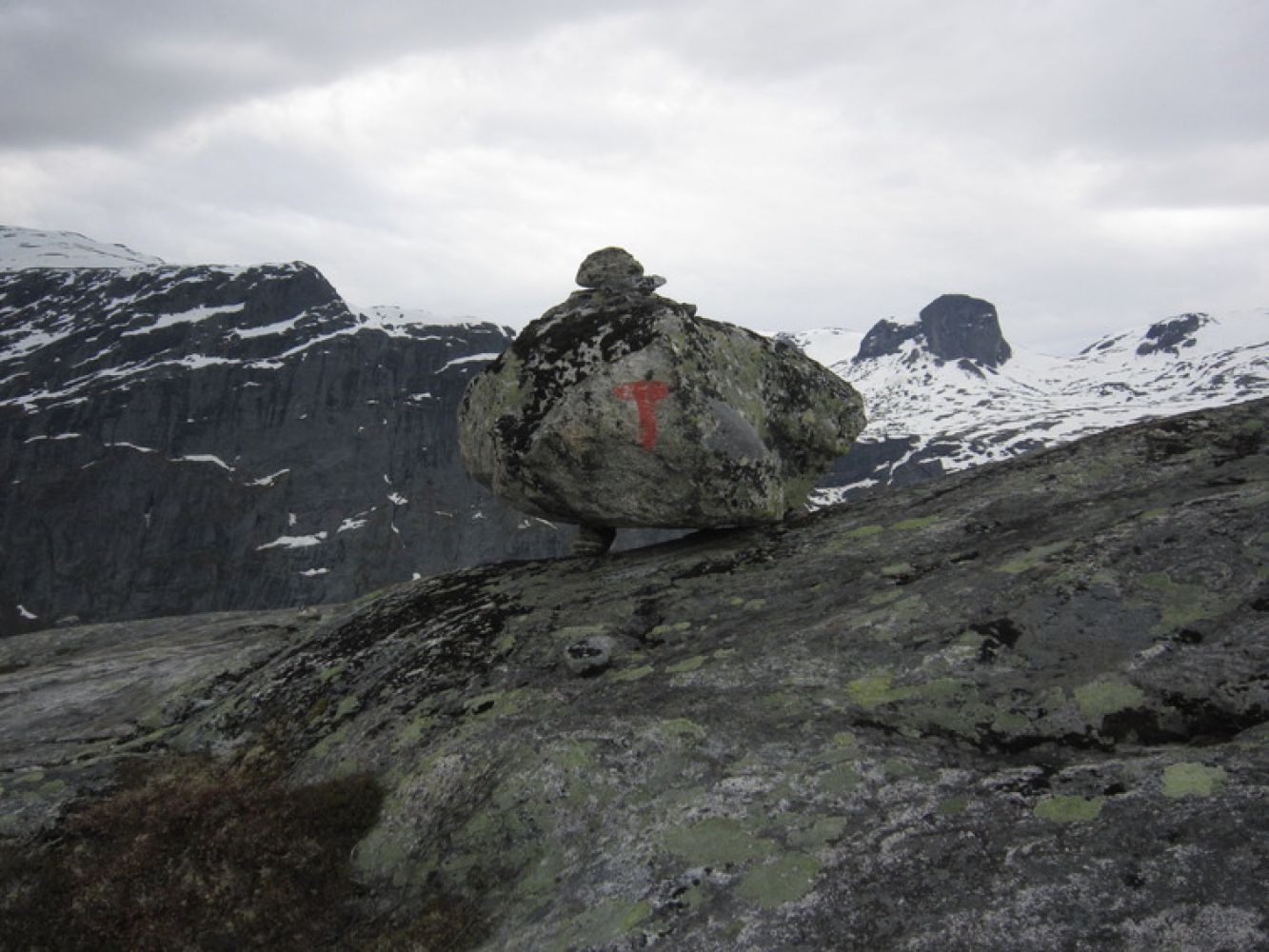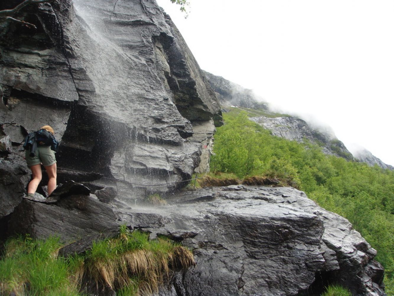 Ved en stor stein krysser stien ei lita ur, før et nytt bratt parti leder opp til topprampen. Like før rampen krysser stien et bratt parti, med en liten foss. Her er det godt sikret med kjetting. Litt oppover igjen etter denne før en følger rampen slakt ut til høyre. I enden av rampen er det et kort bratt parti, før en runder ryggen (vardet) fram til Mongevatnet.