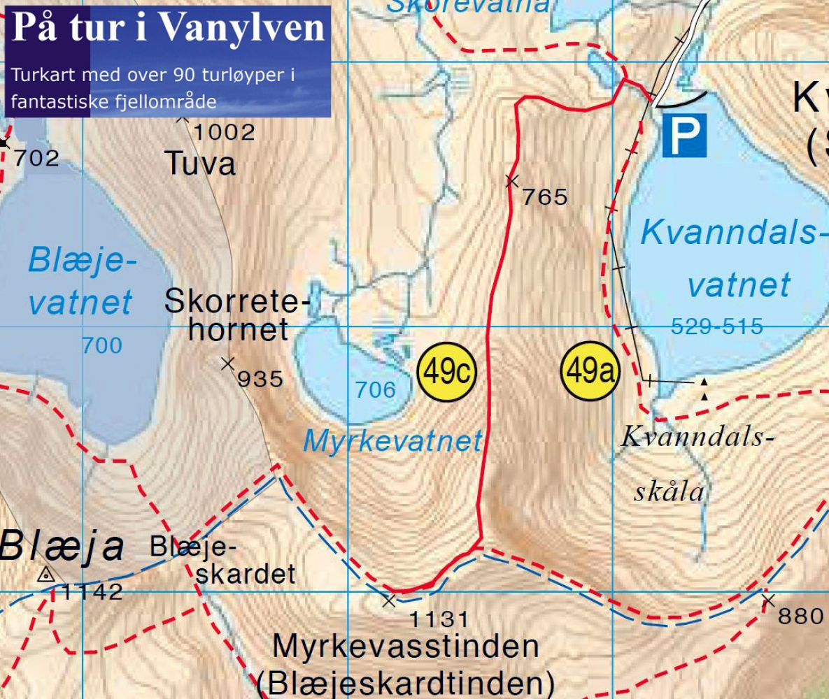 Det er skilta ved startpunktet på turen, og også i stikrysset på toppen av første motbakke. Heile ruta er merka. Sett frå startpunktet ved demninga i Kvanndalen kan delar av turruta sjå litt «nifs» ut, men stien ligg fint plassert i terrenget langs rygg og egg, og er ikkje vanskeleg å gå. Utsikta vert vidare og betre dess høgre opp ein kjem, og på toppen ser ein havet i vest, Sunnmørsalpane i nordaust og store delar av fjellheimen i Nordfjord i sør og søraust. Myrkevasstinden er og eit godt utgangspunkt for tur vidare til Blæja (1142) eller Sandfjelltua (1002). Starten på turen er 530 m.o.h., og det betyr at ein er over tregrensa. Ein slepp dermed unna alt av kratt og anna av irriterande vegetasjon. På nokre kart blir toppen kalla Blæjeskardtinden. Like før ein kjem opp til toppen kan ein ta ein avstikkar mot aust og nyte utsikten frå Kvanndalstinden som er det austre punktet på dette fjellområdet.