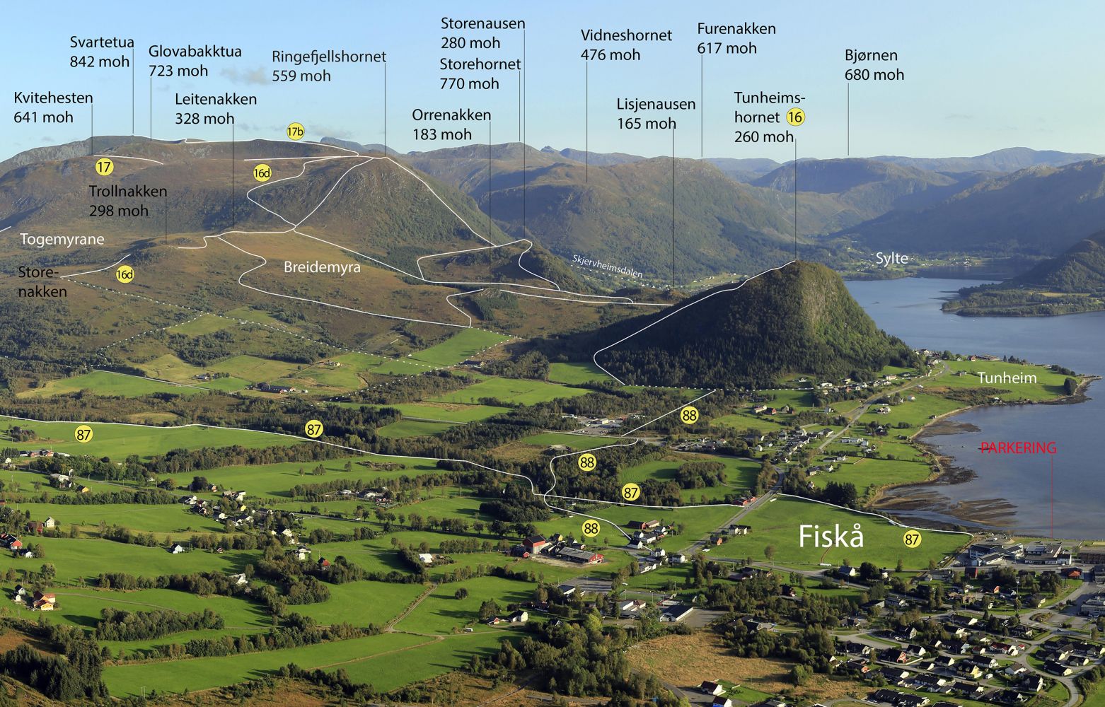 Lett tur på grus og sti frå Fiskå sentrum til nordsida av Tunheimshornet. Ein kan gjerne kombinere denne turen med ein tur over Tunheimshornet.