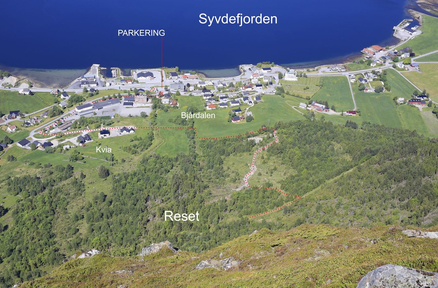 Frå COOP-butikken har ein to alternativ. Det raskaste alternativet som ein ikkje skal gå i vekstsesongen er opp på nedsida av Myklebust skule, forbi eit byggefelt, over ei dyrka mark og deretter i overkant av neste dyrka mark. Der blir marka etter kvart til veg som ein kan følge heilt opp til skogsbilvegen. Reset finn ein heilt på enden av vegen. Altenativt kan ein gå forbi Syvde kyrkje. 300 meter etter kyrkja er det skilta mot Nordal. Gå mot Nordalen, og 10 meter før ein kjem inn i 80 sona tek ein til høgre opp ein skogsbilveg. Sjå elles bileta og kartet for meir info.