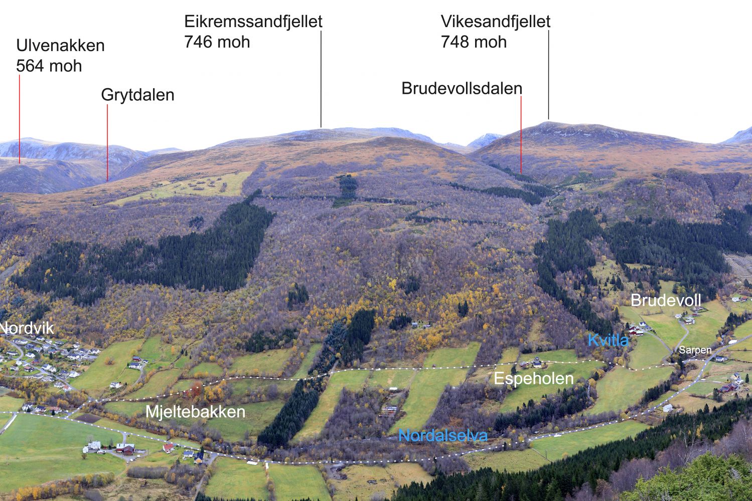 300 meter etter kyrkja i retning mot Volda er det skilta mot Nordal. Gå mot Nordalen, og ta av til venstre over ei bru i kryss nummer to etter at du tok av frå riksvegen ved sjøen. Rett etter brua tek du av til høgre og går relativt parallellt med elva framover i retning Nordalen. På enden av vegen blir det eit kort parti med sti. Stien går over i veg etter ei kort stund, og då er ein framme ved brua over Sarpen. Sarpen er eit elvegjel som elva har gravd ut frå slutten av istida for 10 -12 000 år sidan og fram til i dag. Spesielt flott er det ved stor vassføring. Legg og merke til kvernhusmurane på nedsida av brua.