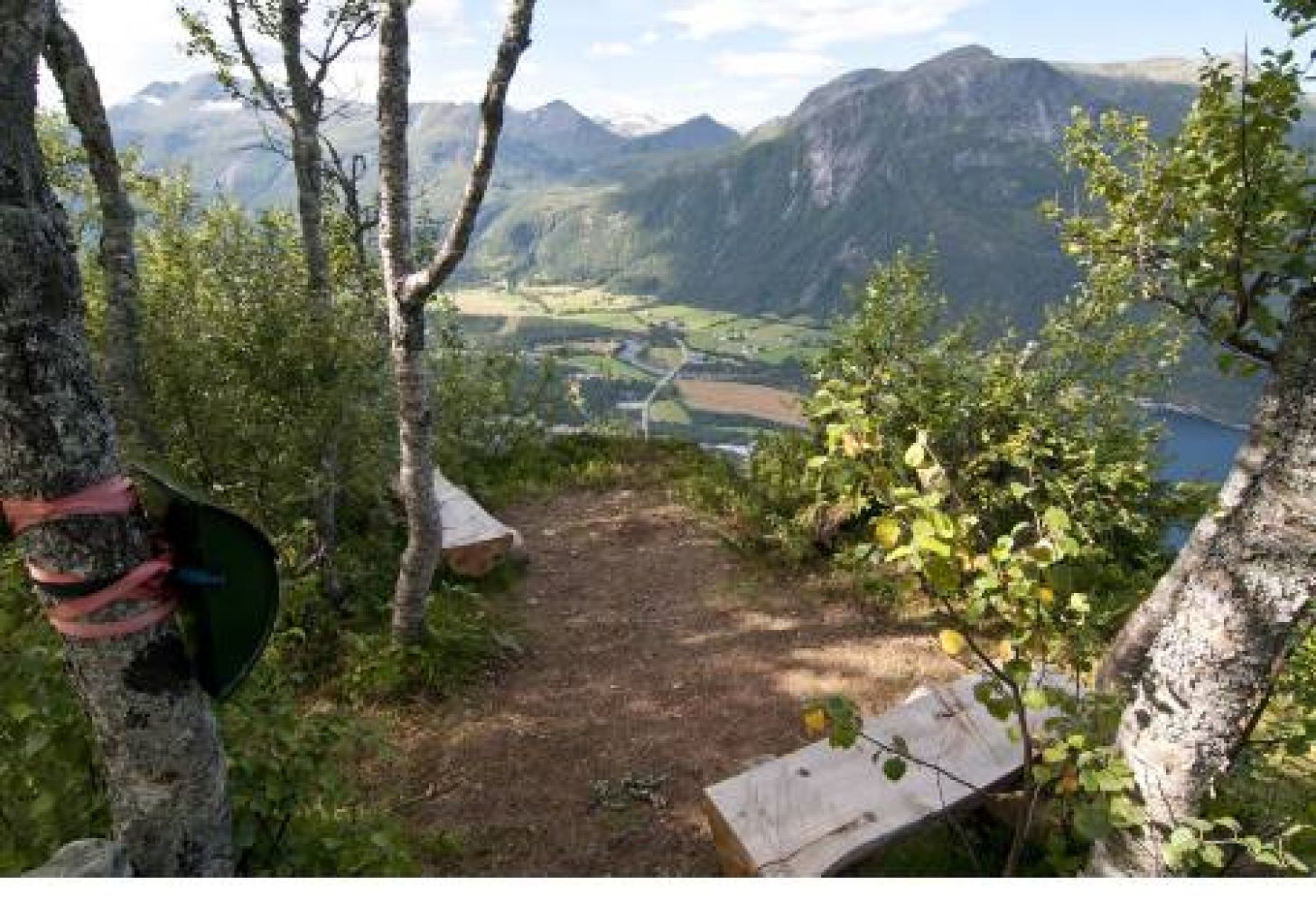 Nakken: Følg skogsvegen. Når du kjem under kraftlinja på skogsvegen er det eit tydeleg tråkk ut til høgre. Ta av her og inn på god sti opp bjørkaskogen. Du kjem inn på ein anna skogsveg lenger oppe. Etter eit kort stykkje er du på utsiktspunktet Nakken.