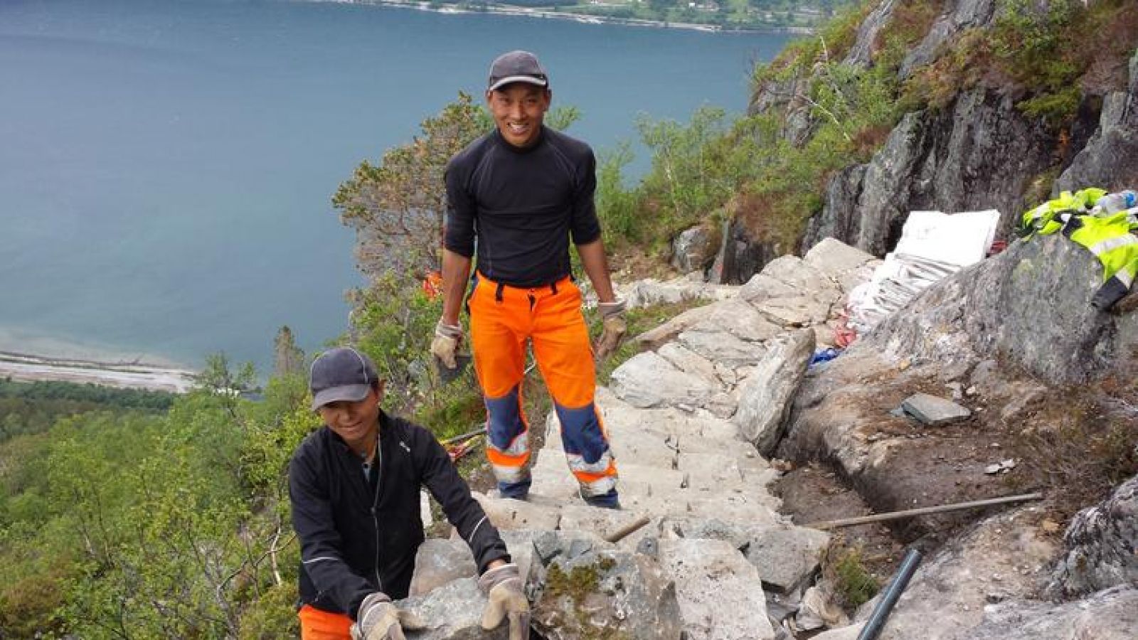 Romsdalstrappa fortsetter videre oppover til toppen og innimellom er det laget små benker. Mot slutten er det en liten hammer før terrenget legger seg innover til steinhytta på toppen.