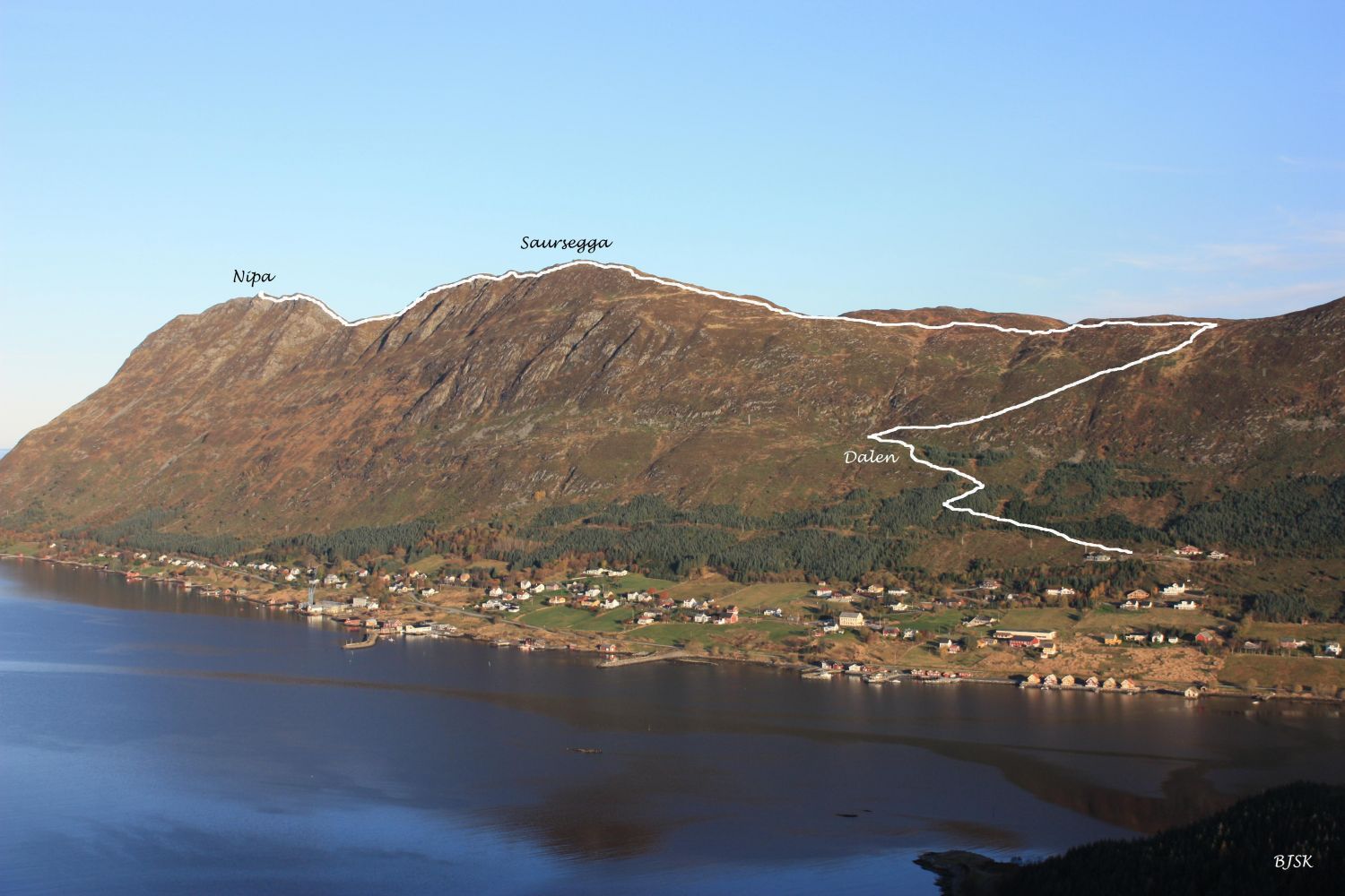 Start i Haugelia byggefelt. Råsa byrjar vestapå dei to siste husa i byggefeltet. Råsa går først gjennom skogen, kan vere litt vått her på enkelte parti, oppom skogen kjem du opp på Dalen med restar etter gamle vårfjøsar. Derifrå fylgjer råsa den gamle kløvvegen som er oppmura oppigjennom fjellsida. Når du kjem oppom kløvvegen er der eit råsdele, her tek du til venstre og fylgjer råsa opp ryggen til høgspentlinja, då deler råsa seg, den til venstre går over myrane til Saursegga og vidare til Gjøna/Nipa, den til høgre går til Hanen og vidare til Saursegga og Gjøna/Nipa, begge råsene ligg i GPX fila. Når du kjem bort til ryggen opp til Saursegga går råsa etter høgste ryggen over Saursegga og ned til lavaste punktet mellom Saursegga og Gjøna/Nipa, derifrå går råsa til høgre og går opp på nordsida av det brattaste partiet, då er det berre å gå ryggen ut til toppen. Når du kjem opp er det vel verdt slitet, herifrå har du ei fantastisk utsikt. OBS Vis varsemd, svært bratt utføre på sørsida. Vegkryssa er skilta mot Nipa til du kjem opp til høgspentlinja, deretter er det skilta mot Gjøna. (Nipa er Haugsbygdnavnet på toppen, Gjøna er Gjerdsviknavnet på toppen)