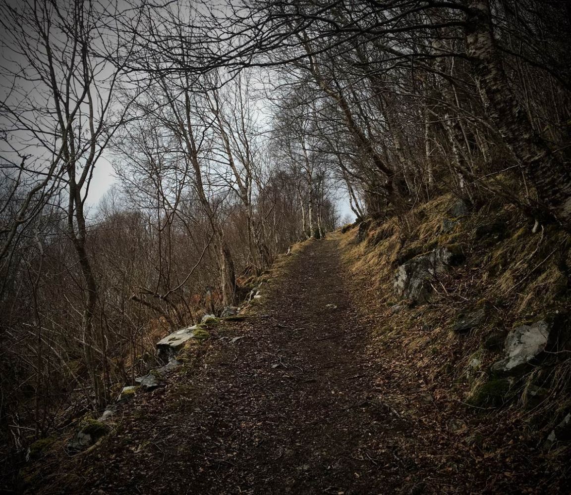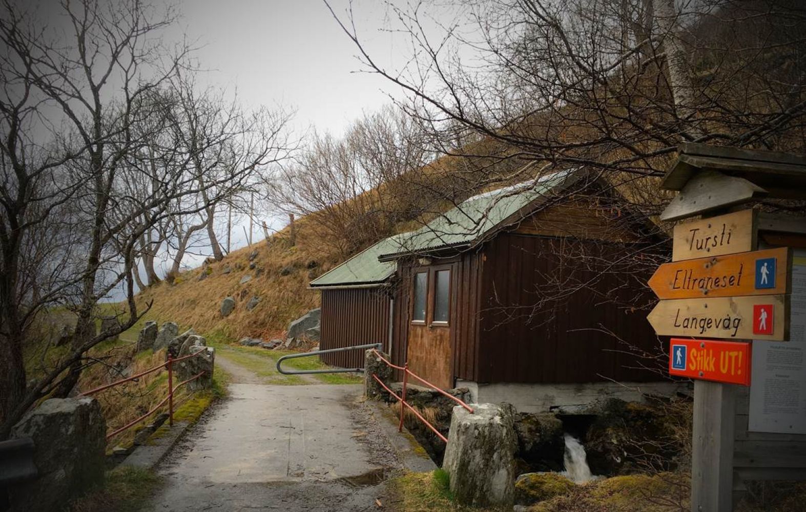 Følg den mosegrodde kjerrevegen etter brua over Storelva. Etter ca 100 meter deler denne seg og du skal holde til høgre og følgje skiltinga mot Gjerdet og Eltrane. Her kjem ein lang motbakke på fin kjerreveg med flotte mosegrodde steinar etter gamle ras og tomtegrenser. I det den flatar ut kjem du opp på bøane. Her finn du Stikk Ut-posten. Turstien går vidare til fjells og kan anbefalast. Hugs at du no er på sørsida og at du på ein solrik dag kan møte på hoggorm. Ta på deg gode sko. Det er og mykje flått i området så sjekk alltid kroppen etter ein tur.