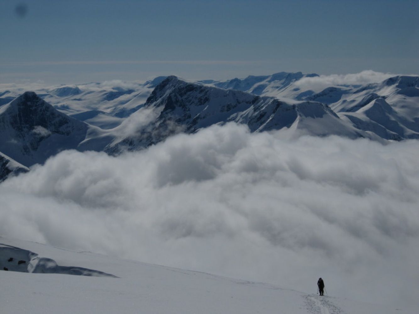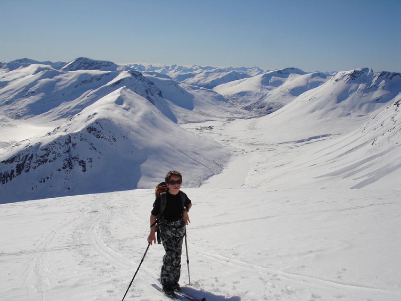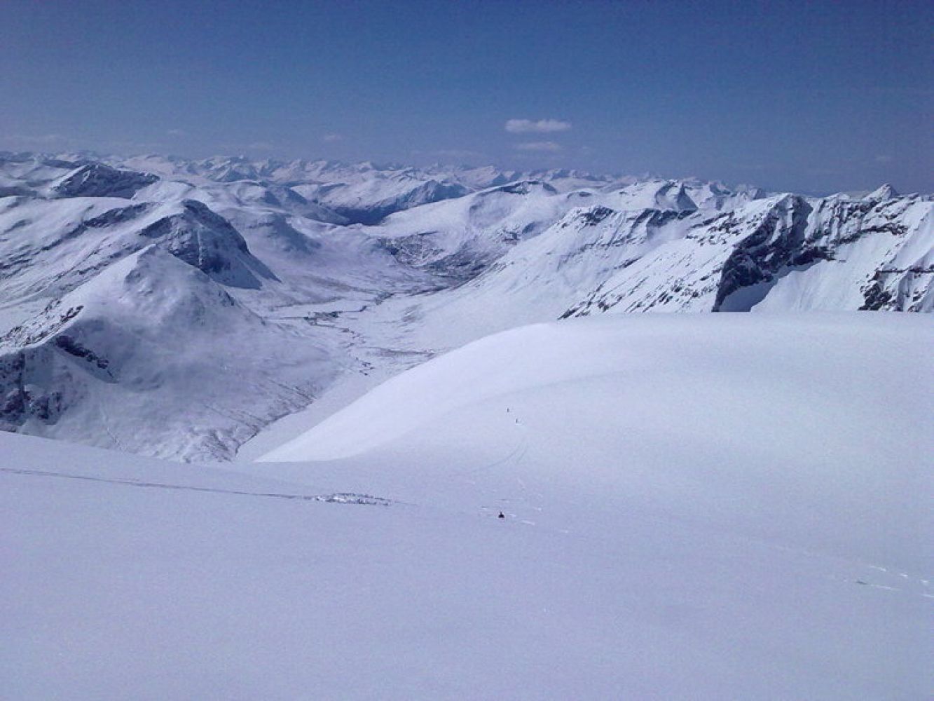 Følg ryggen til toppen av Nonstind, hold litt til venstre like før toppen for å unngå et skar (se opp for skavler).