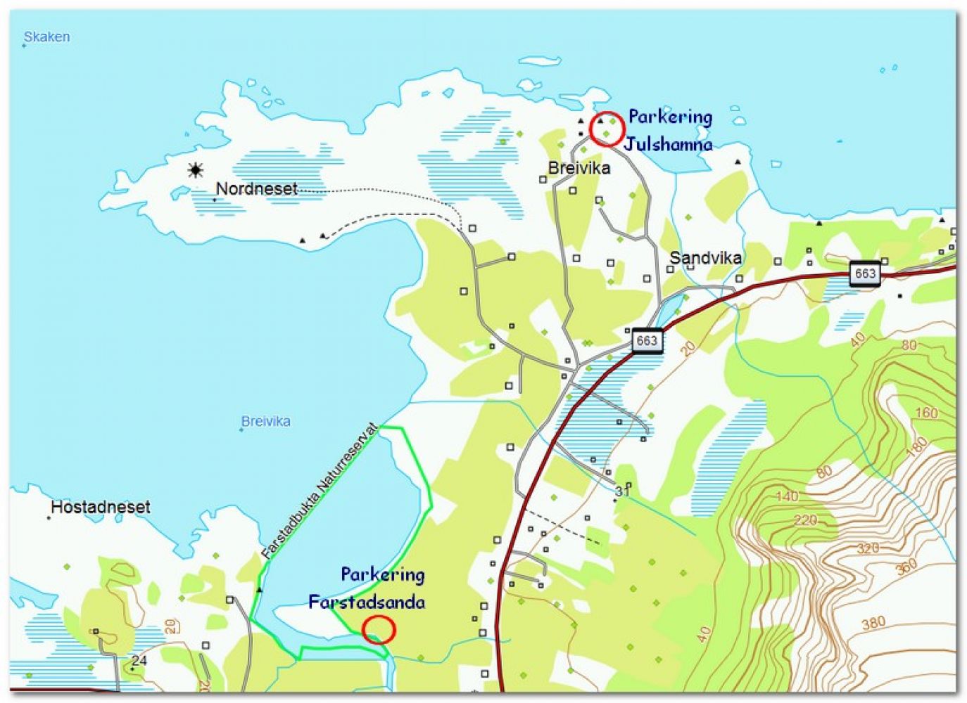 Farstadsanden er et godt skiltet som attraksjon av Nasjonal Turistveg, og det beste startstedet. Lett og fin tur til Nordneset Fyr. Alternativt kan du parkere i Julshamna lenger nord, men her er det få plasser. Man kan gå via Nordneset, frem og tilbake til Farstadsanden. Dette blir da en mye lengre tur.