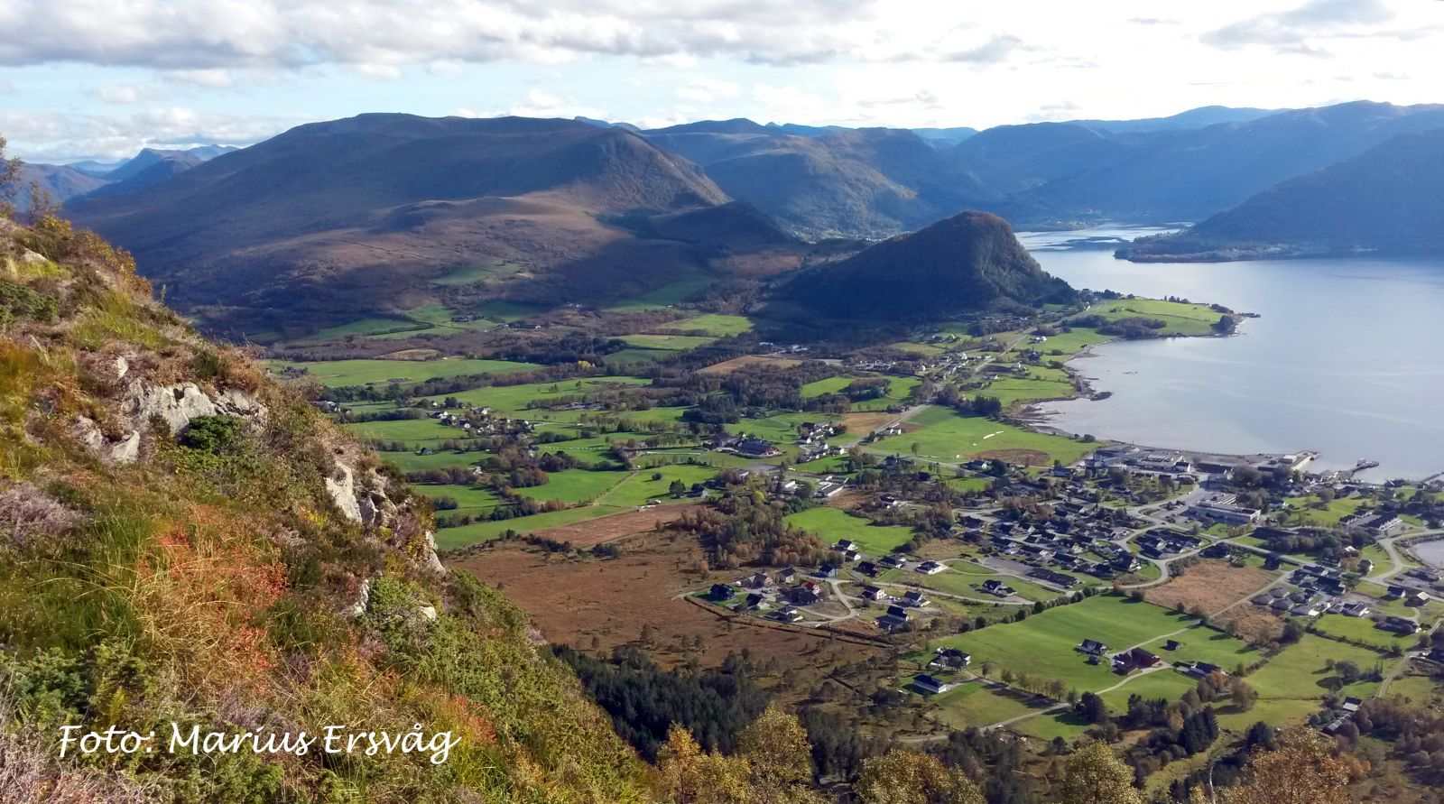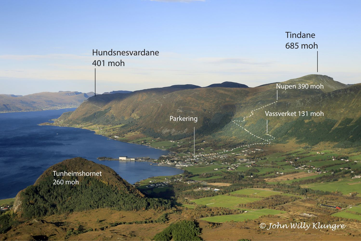 Frå parkeringen krysser du riksvegen og tek til venstre bortover gangvegen ca 100 meter. Ta til høgre ved blått skilt og følg asfaltert veg mot fjellet. Rund første låve på venstre side og hald fram oppover. Det blir etterkvart grusveg. I skogen deler grusvegen seg i to. Hald till venstre og følg blå pil (Om du går til høgre og følgjer grøn pil kjem du til Vassverket, sjå annan tur). Grusvegen går sikksakk oppover, med dei brattaste bakkane mot slutten. Det siste vesle stykket må du gå på rås.