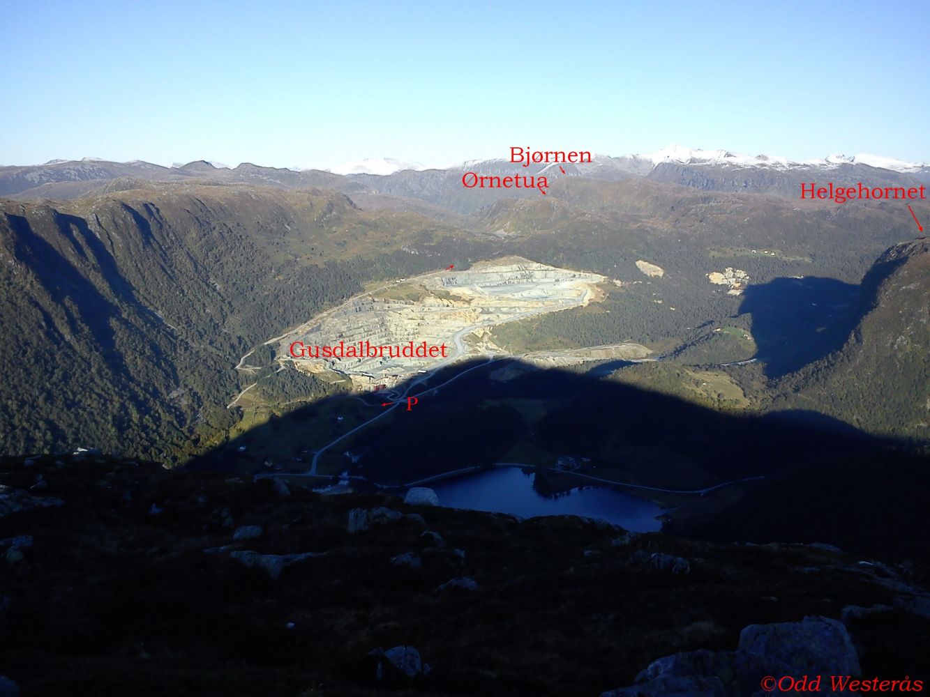 Ein forholdsvis lettgått tur der meir enn halve turen går på god grusvei. I starten går ruta langs Gusdalbruddet. Fra dette dagbruddet tek Sibelco Nordic på Åheim årleg ut rundt 2 million tonn olivinstein som blir knust og sikta ut i forskjellige fraksjonar. Noko blir også vidareforedla til ildfaste produkt. Steinen blir frakta frå buddet og ned til anlegget på Åheim ved hjelp av eit 4 km langt transportband som går i tunnel gjennom fjellet og kjem ut ved fjorden der anlegget ligg.