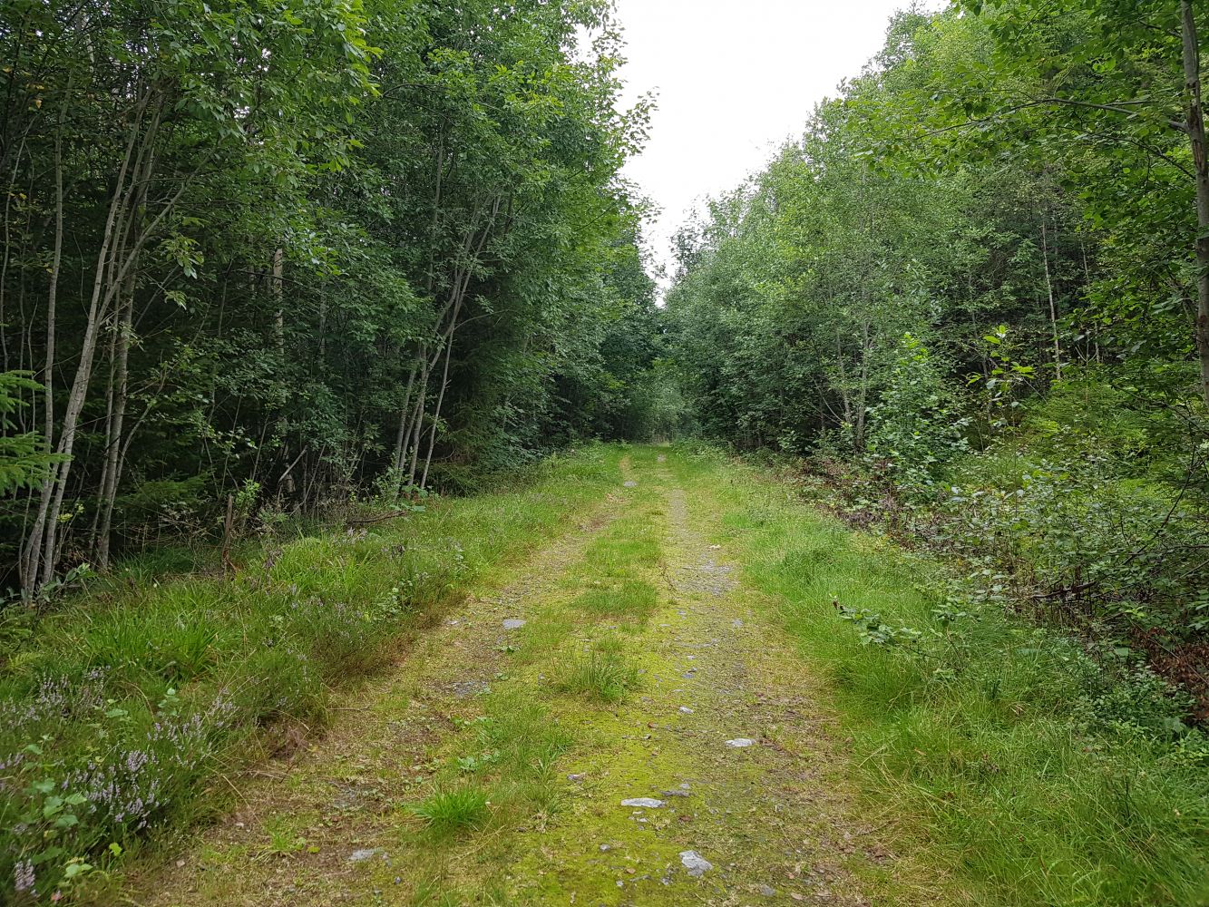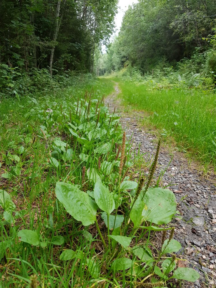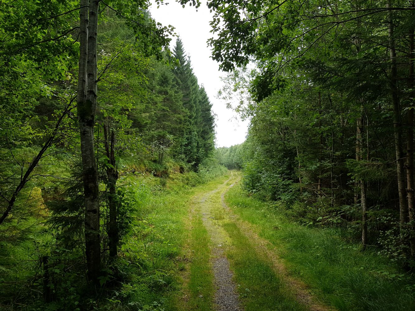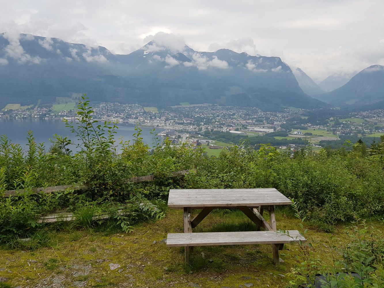 Småkupert grønvekst turveg som held omlag same høgde bortover fjellsida til utkikspunkt over Ose og Ørsta sentrum