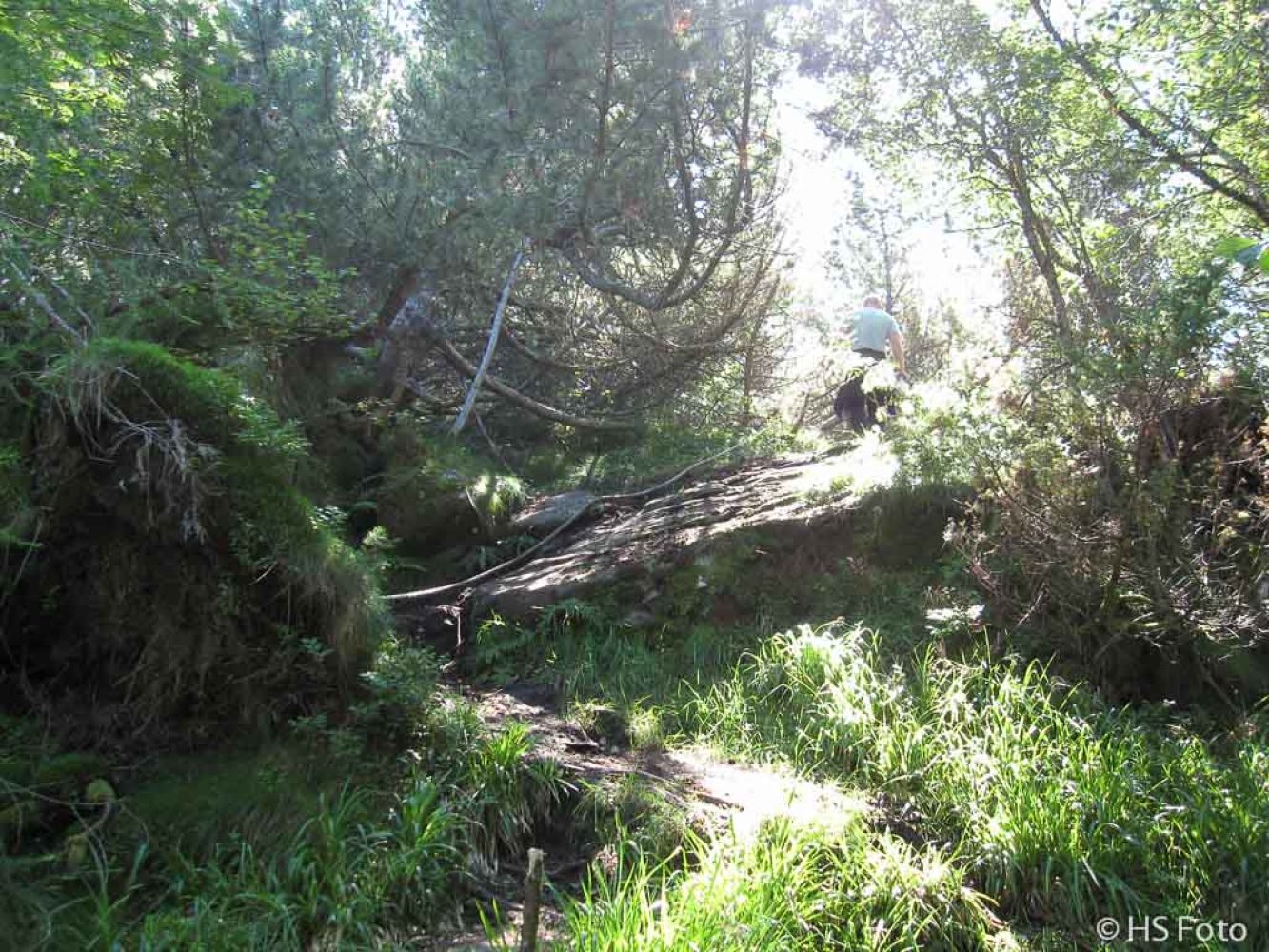 Noen få meter bak utsiktspunktet er stien sikret med tau ned en liten skrent. Dette fordi at det kan være glatt over dette berget. Når du har kommet ned berget, deler stien seg igjen Vi tar til høyre her. Stien til venstre tar deg ned til bebyggelsen ved Skeide.