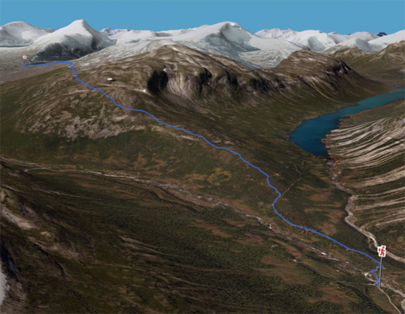 Stien følger venstresida av Lågtunga flatt innover følger terrenget naturlig innover til Rundhaugen, før den begynner å skrå slakt nedover til Pyttbua. Turen byr på fantastisk utsikt mot fjella i området, og er godt vardet hele veien.