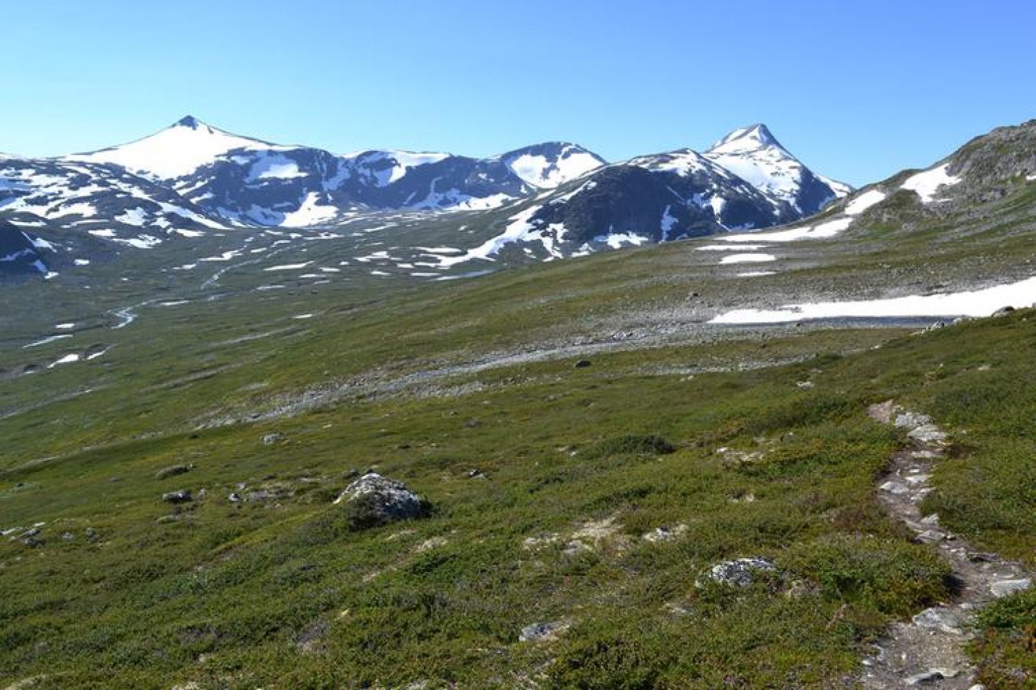 Følg stien gjennom skogen, og en kommer gangse raskt over skoggrensa. Stien følger en rygg oppover mot Tungesnyta, som passeres til venstre. Mesteparten av stigninga på turen er i starten opp mot Tungesnyta.