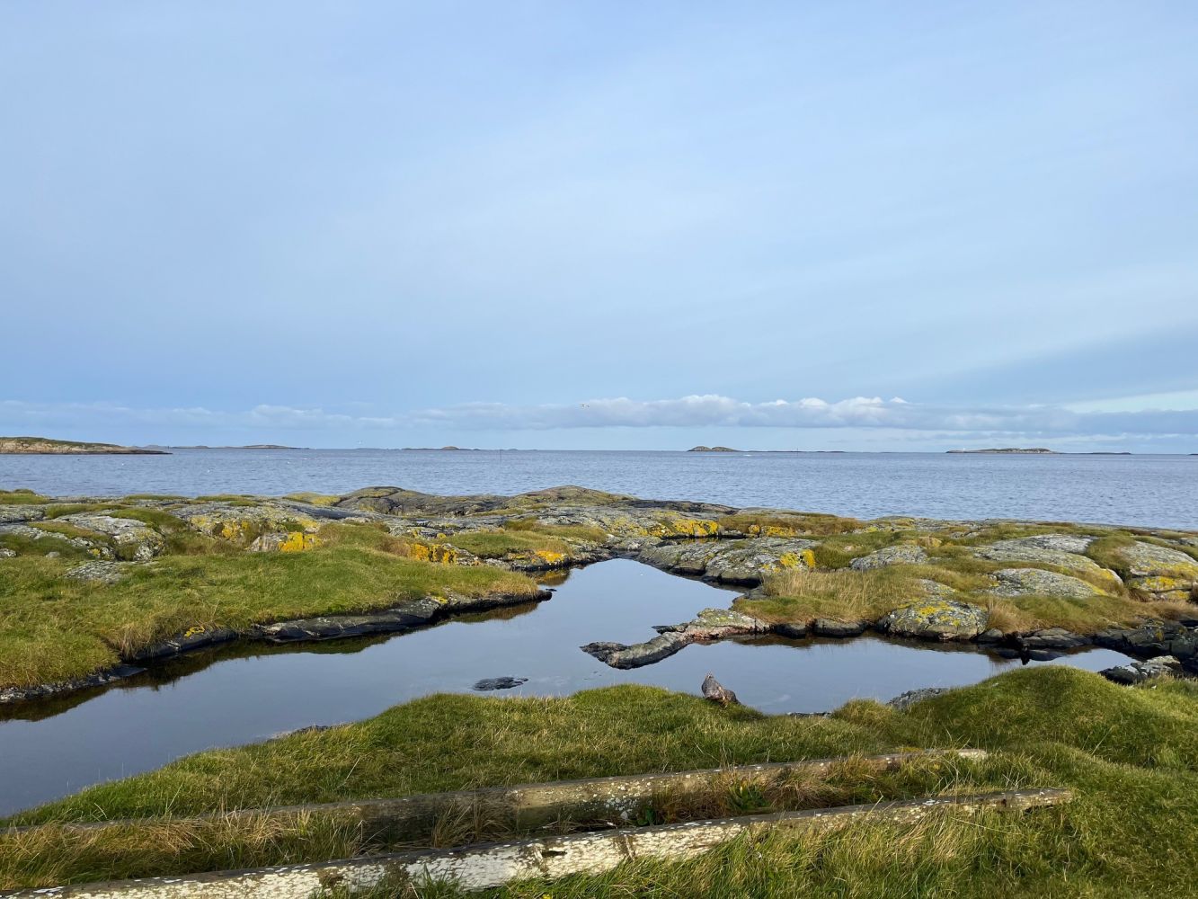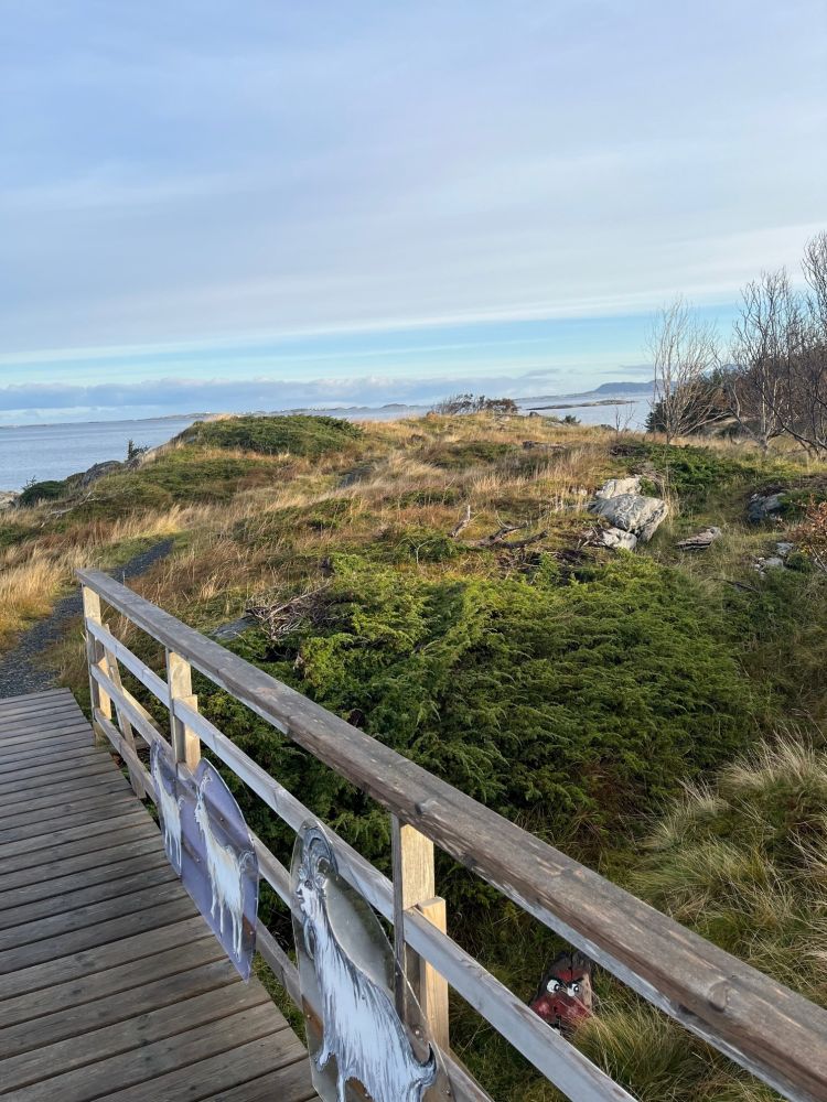 Frå parkeringsplassen går du på bilvegen nordvestover, opp bakken som svingar mot høgre. Ta 2. veg til venstre, du ser då Roktamonumentet. Stien startar når du går gjennom gjennom grinda ved Rokta monumentet. Starten av stien er grusa. Du kjem raskt til ei bru, etter denne følgjer du stien som går svakt til høgre. Etter vel 100 meter kjem du til gapahuken som ligg på høgre side. Litt nedom gapahuken er det ein liten sti mot venstre som går bort til ein dam der du finn fine små miniatyrar. Stien går vidare mot nordaust.I finver kan du også gå heit ned på det borterste berget. NB Du må ikkje gå dit når det er ruskever og storbåre. Det er farleg, ein veit aldri når ei ekstra stor båra slår over skjæra.