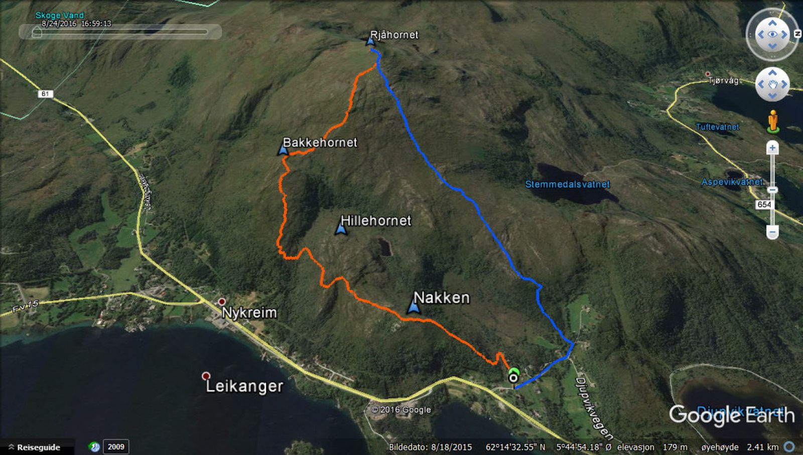 Så går ruta ned mot inngangen til Trongedalen og møter ruta fra Leikong. Her kryssar ein over ein liten bekk og følgjer heia opp til Bakkehornet. No er ein ca. halvveges i høgd.