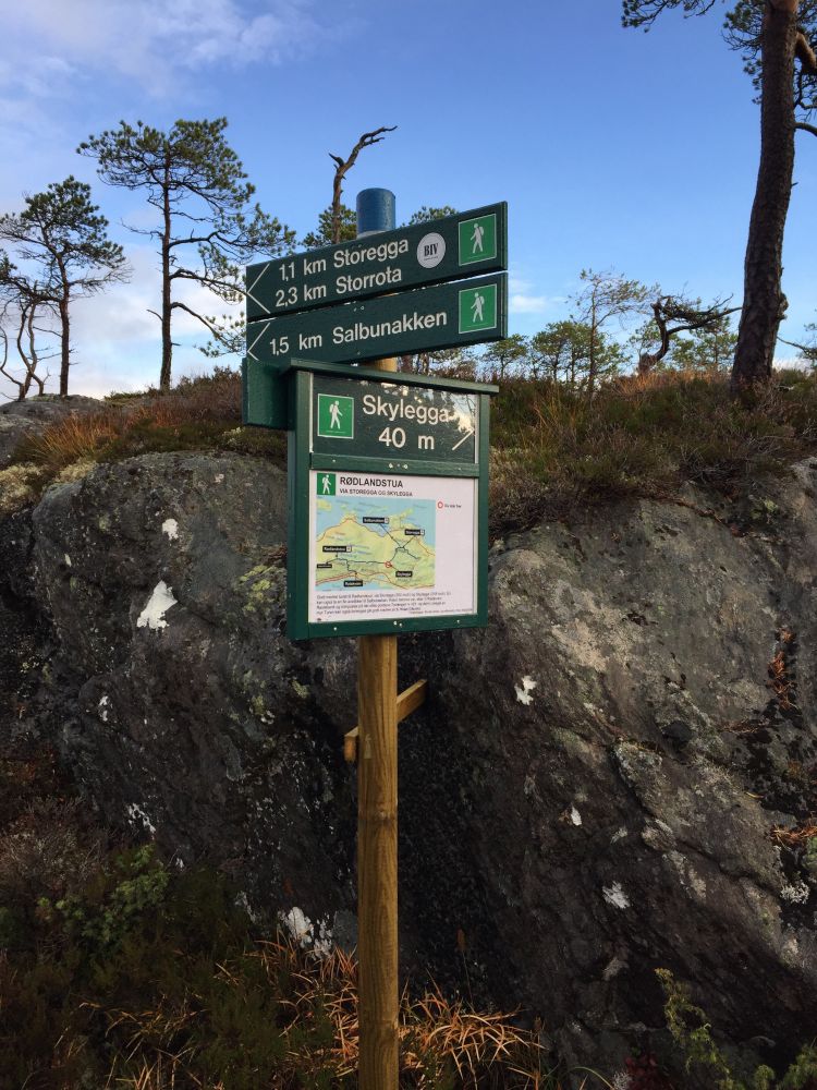 Turen starter på Storrota. For å kome seg til Storrota må ein gå grusvegen (700 m) opp frå Utvika mot Brusdalen. På Storrota er det plassert ei infotavle med kart og beskrivelse av turen og turen starter på sti mot vest. Skilt med anvisning om sted og avstand er plassert langs ruta. Mellom avstandsskiltene er stien markert med påler som er malt blå i toppen. Pålene har også refleks, så turen kan gåes i mørket med hodelykt. Terrenget er preget av myr og våte partier flere plasser og tett fottøy er helt nødvendig uansett årstid. Etter passering av Storegga tar stien etterhvert i retning sør mot Skylegga. Frå Skylegga følger man stien mot vest og man ser Brusdalsvatnet på venstre side. Dette partiet av stien er delvis preget av tett skog og myr. Etterhvert møter en stien Reiakvam-Rødlandstua. Her tar en mot nord og følgjer stien til toppen. Fra Rødlandstua er det også en mulighet å fortsette helt til Holen.