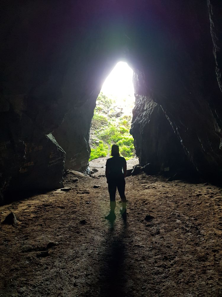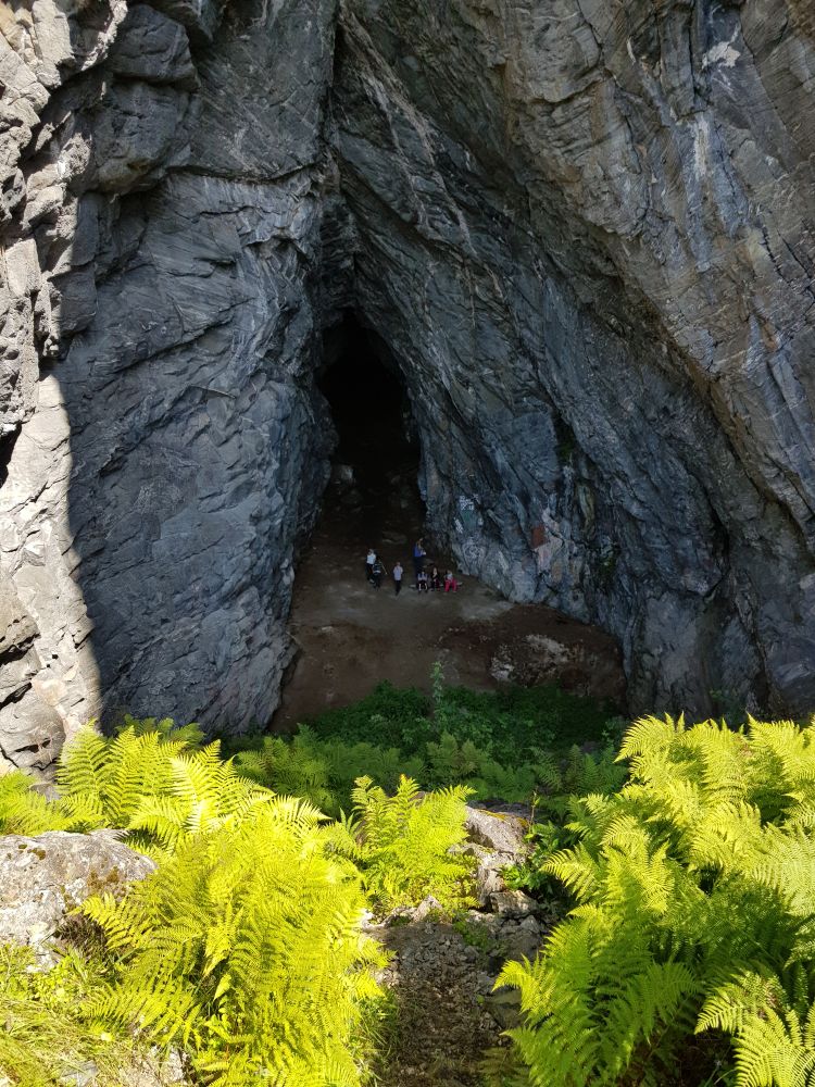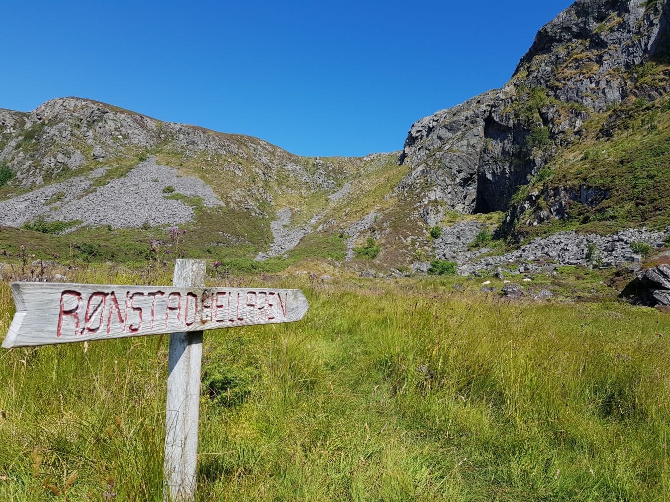Frå Rået går det skilta tydeleg rås i god stigning opp grasryggen mot den godt synlege hellaren, men sus av forhistorisk tid. Ei gammal segn fortel om ein hund som graup inn gjennom Rønstadhellaren, og kom ut att i Skjonghellaren på Vigra, nokre dagar seinare, men då hårlaus.
