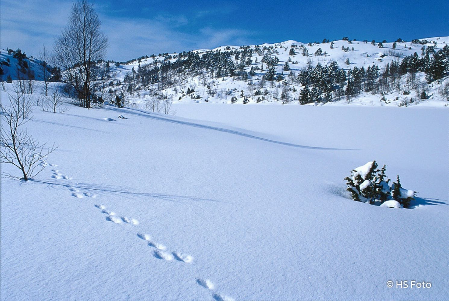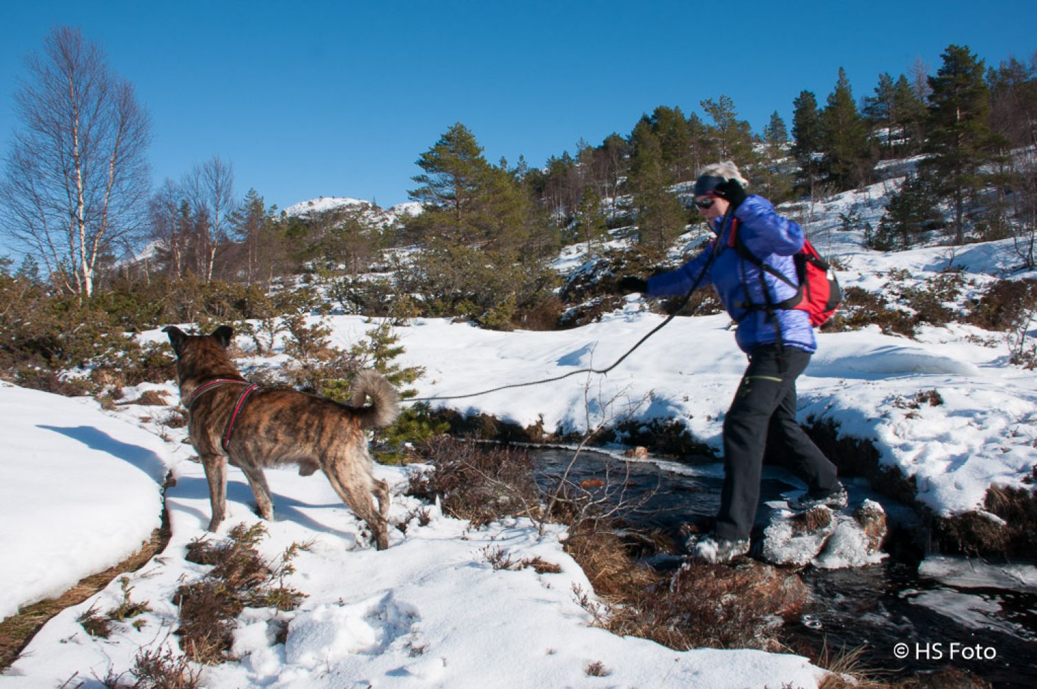 Det er denne tydelige stien (skitraséen), langs nordsiden av vatnet mot vest, vi skal følge. Her er det brøytestikker, med jevne mellomrom frem til Eikenossætra. Du er snart tilbake til broen, som vi passerte i sted. Nå tar du deg over denne til sørsiden av Røssevollsvatnet igjen og følger hovedveien ned igjen til parkeringen på Eikenos.