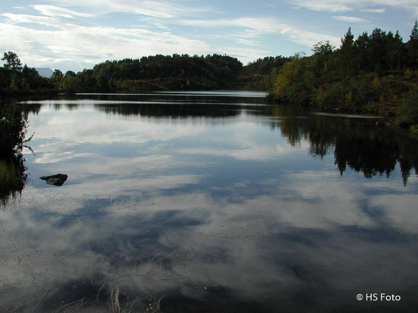 Vi fortsetter ‘bilveien’ opp mot vatnet, den tar deg helt frem til du kommer til en bro, midt på vannet. Denne skal vi ikke over, ennå, men følg veien langs vannets sørside noen hundremeter til, ca. 370 meter.Du står da foran en 220 meter lang demning, som vi skal over. Vel over denne har du to valg, du kan enten gå mot nord og langs vannet i terreng uten god sti, eller du kan fortsette mot øst på stien foran deg.
