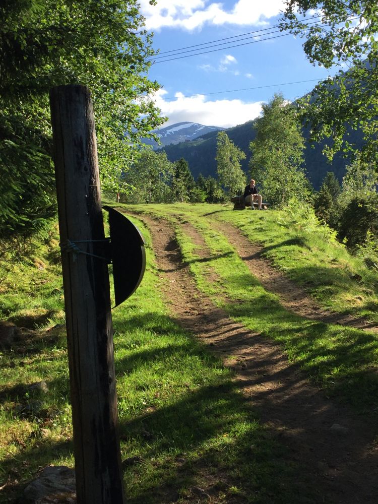 Vi kjem inn på kommunevegen i byggjefeltet i Kalvegjerdet og følgjer han til venstre ned på hovudvegen. No er det berre å rusle nedover att til sentrum på den asfalterte gangvegen, omlag 1 km.