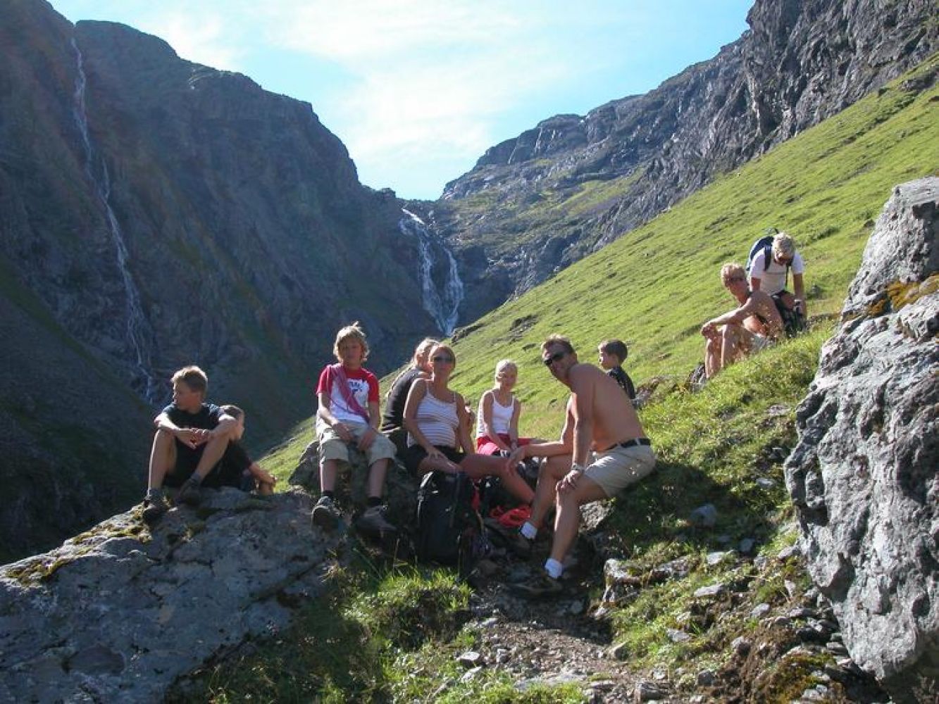 Det er noen traktorveier som en følger delvis, men stien tar stort sett av til venstre på disse. Før skoggrensen går stien bratt oppover. Etter skoggrensen er stien tydelig der den krysser ura fram mot elva, der det blir bratt. Det bratte partiet er godt merket, og sikret med kjetting og wire. Der er luftig ca. 300 meter, før terrenget legger seg og stien krysser oppover ura til toppen av skaret.