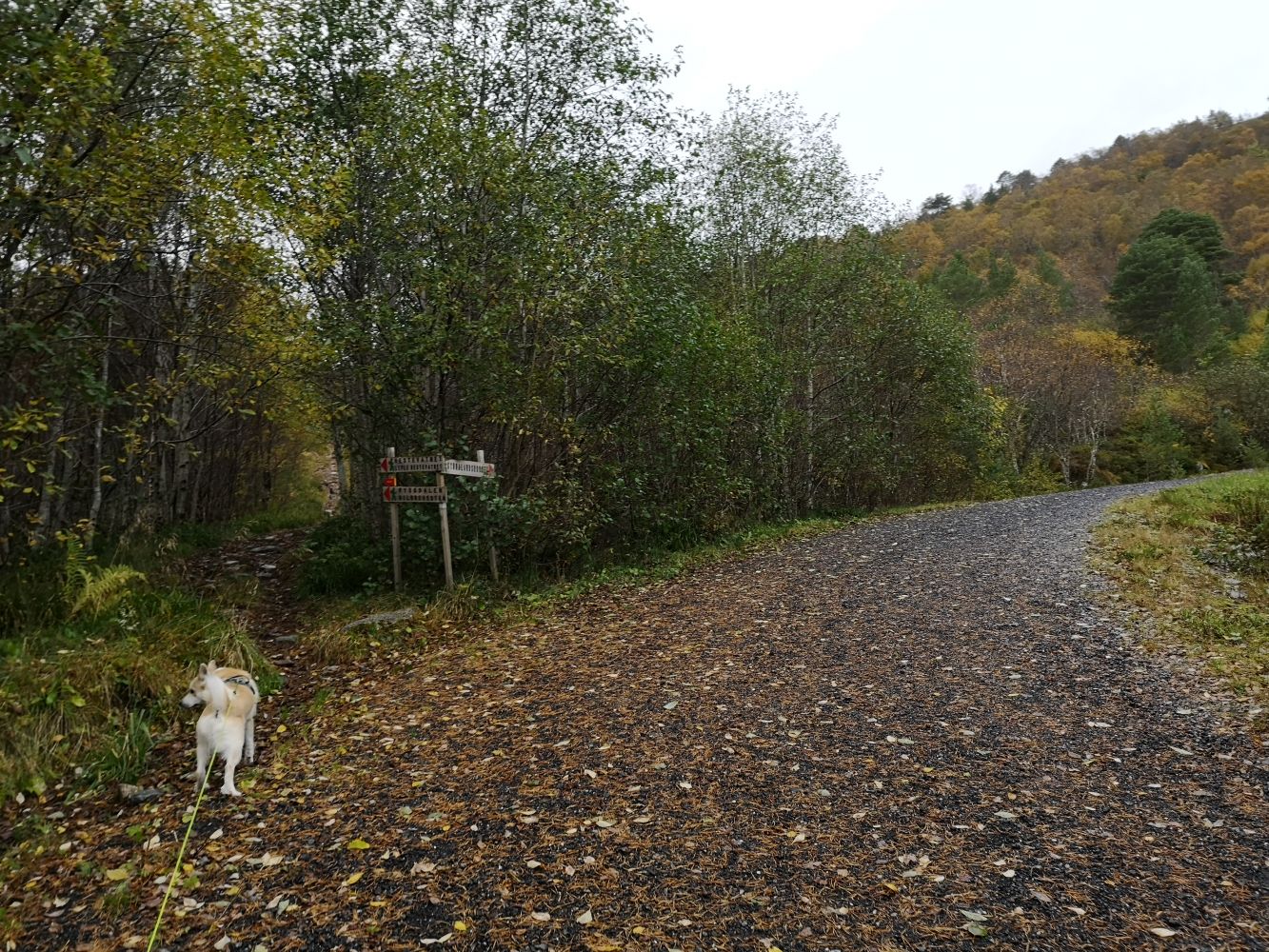 Du kan enten gå same vegen nedatt, eller ein litt brattare rås rett ned gjennom skogen.