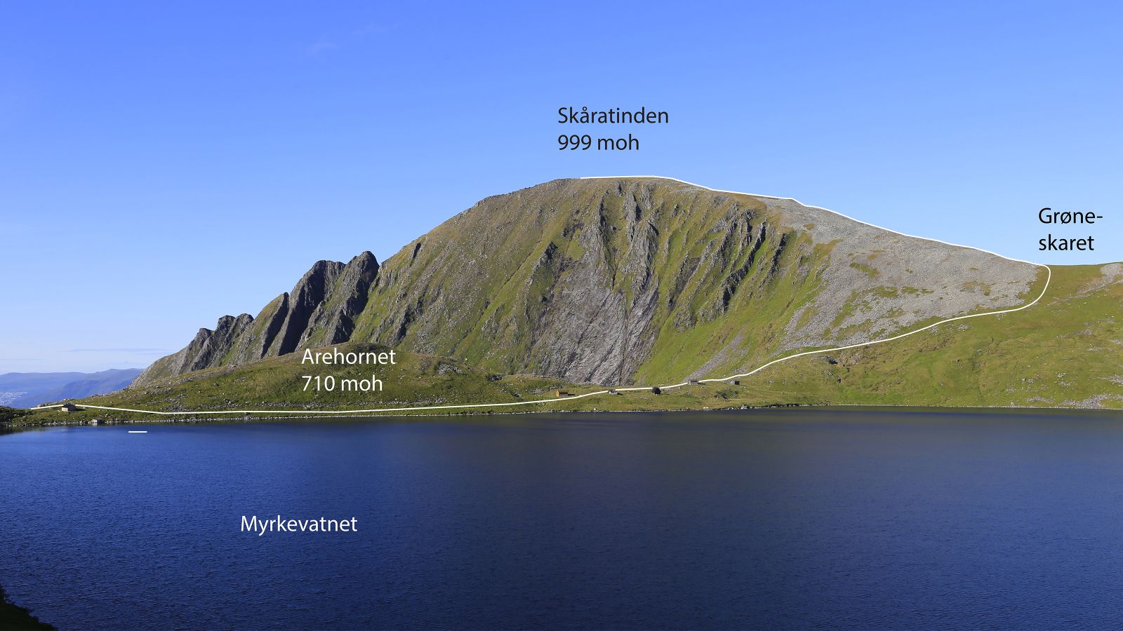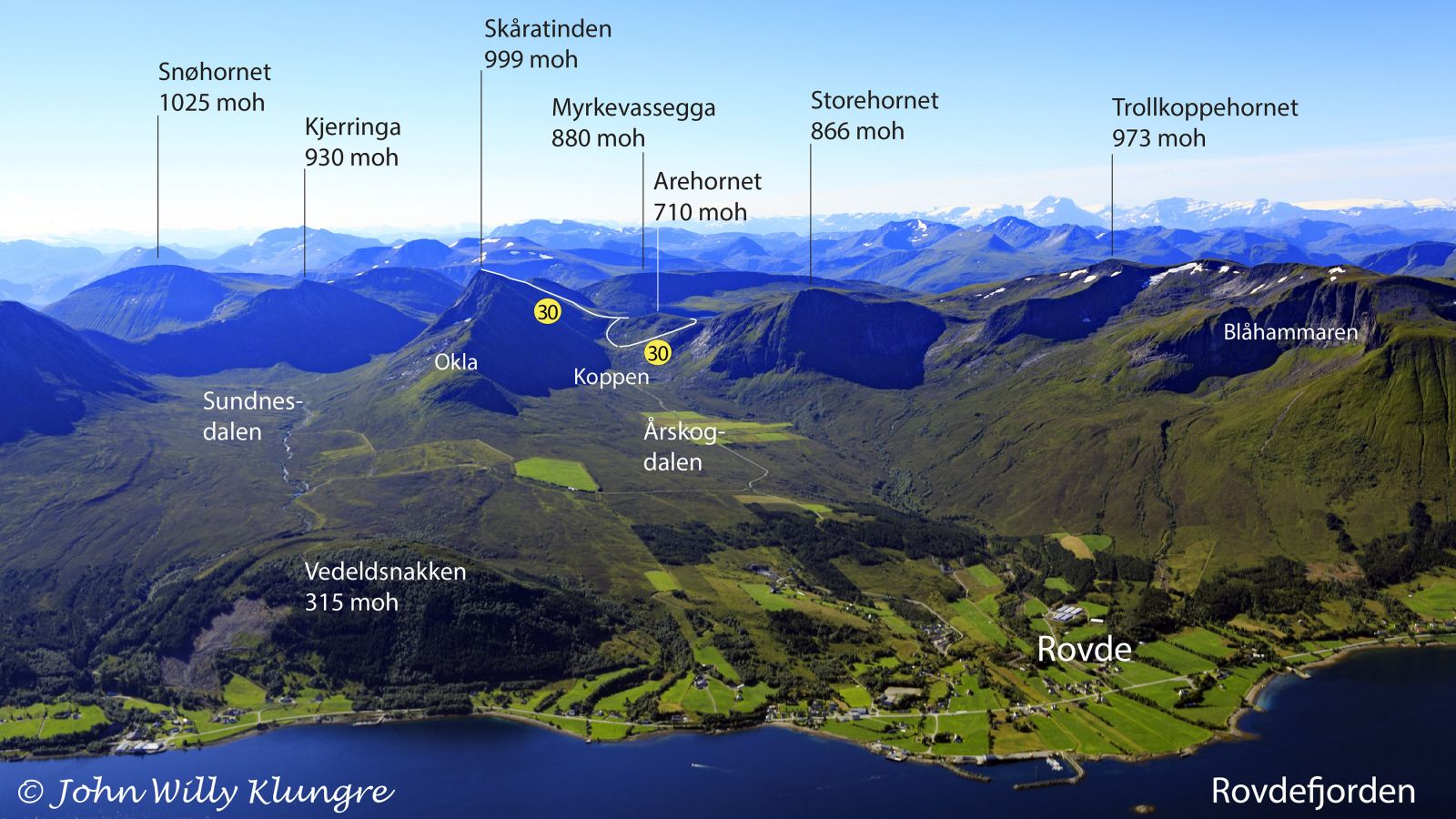 Flott utsiktstur til eitt av dei flotte symbolfjella på Rovde. Skåratinden er eit relativt frittliggande fjell på Rovde med god utsikt i alle himmelretningar. Toppen av fjellet er godt synleg frå både Ulsteinvik og Volda og også frå delar av dei andre nabokommunane. Veg heilt opp til 535 moh gjer at fjellet er raskt og lett å nå. Allereie etter vel 100 høgdemeter får ein utsikt mot havet, og utsikten vidar seg ut når ein kjem høgre opp. Turen går i lett og jamt over tørt terreng. Det langstrekte fjellet er forma hovudsakleg av dalbreane som laga Sundnesdalen og Årskogdalen på kvar si side av fjellet. Fjellet har menge tydelege skar eller skorer og namnet kjem nok av dette. Nokre kart nyttar skrivemåten Skoratinden i staden for Skåratinden. Botnbrear har og vore aktive for å forme terrenget, og ein botnbre har laga botnen fremst i Årskogdalen. I denne delen av landet blir ein slik botn ofte kalla ei skål eller ein kopp, og botnen fremst i Årskogdalen heiter Årskogkoppen. Dermed er det lett å forstå at den raskaste og brattaste ruta opp til Myrkevatnet blir kalla å gå opp Koppen.