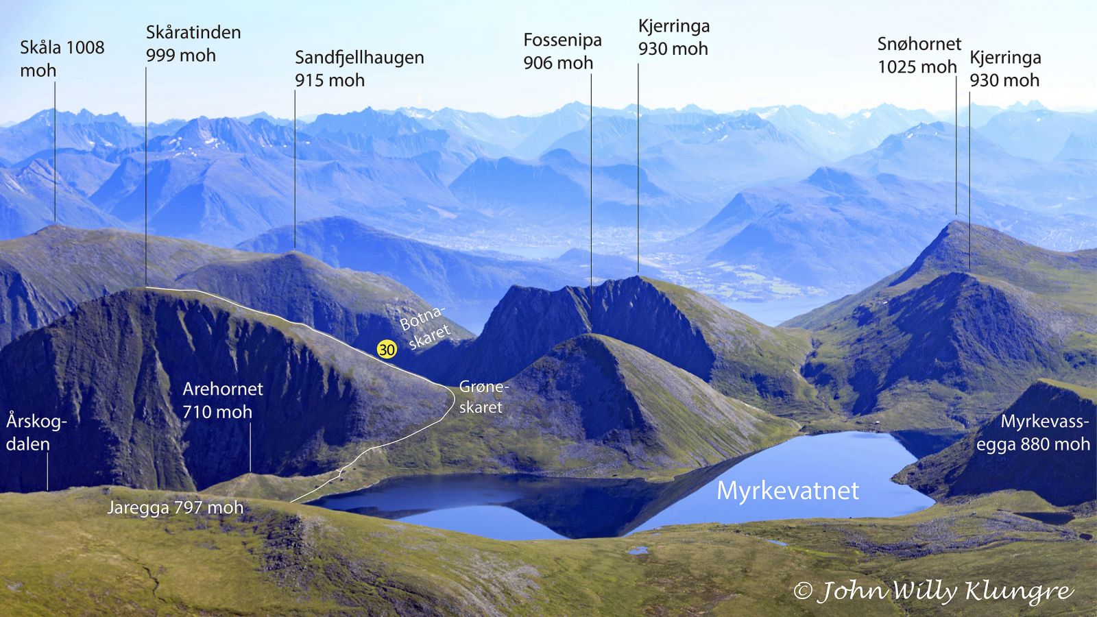 Turen går frå enden av vegen i Årskogdalen, opp til Myrkevatnet, og derifra opp ryggen mot toppen av Skåratinden. Kortaste rute opp til Myrkevatnet er opp Koppen. Ei lenger og slakare rute opp til Myrkevatner er opp Riddarvegane. GPS-fila og kartet nedanfor har oppstigning opp kortaste rute og ei slakare nedstigning frå Myrkevatnet.